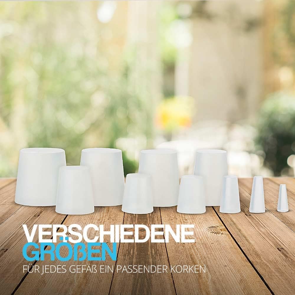 - Lieferumfang – Das Mix- Set besteht aus 10 unterschiedlich grossen Silikonstopfen zum wiederverschliessen und abdichten.