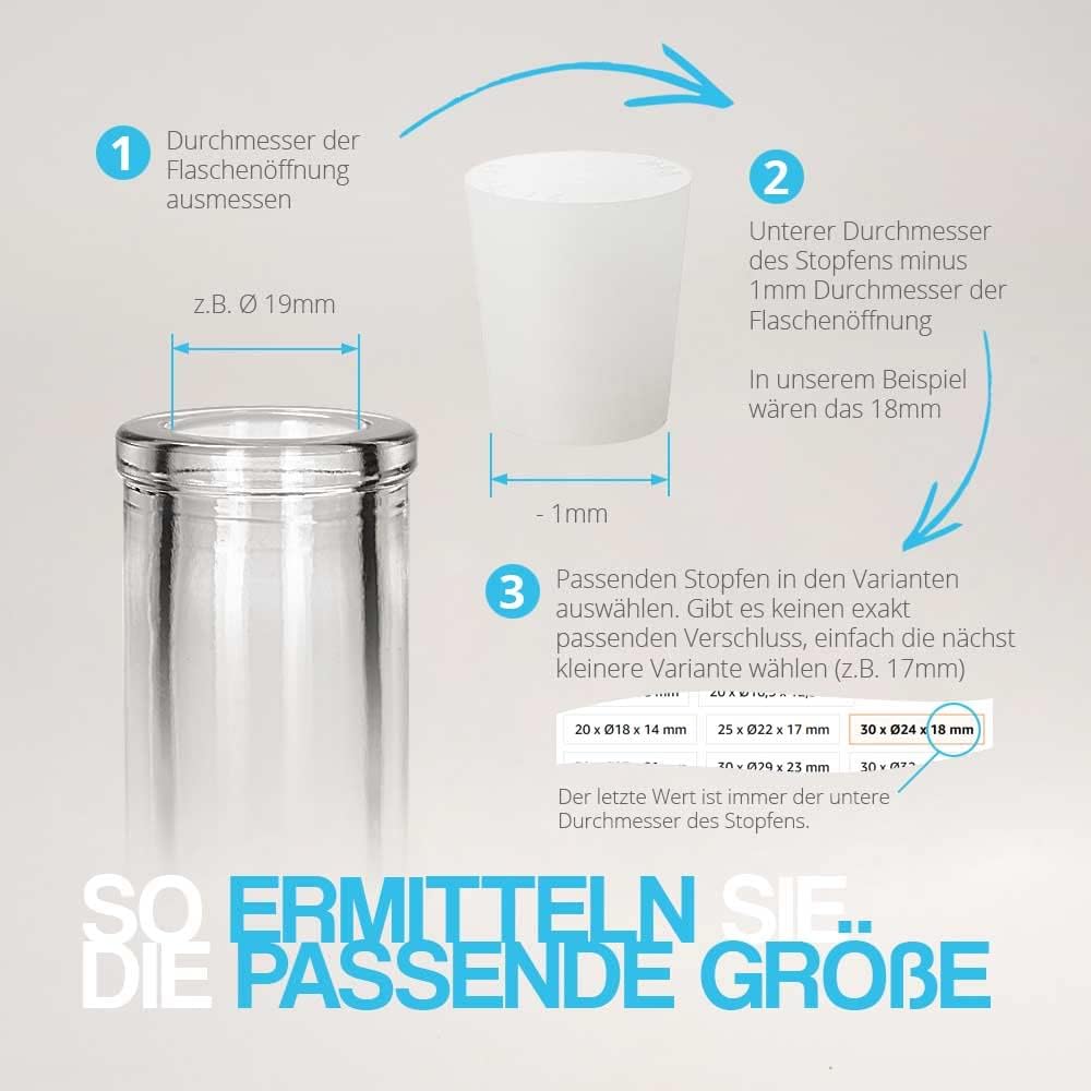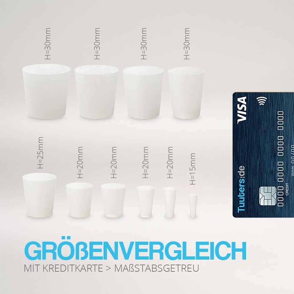 - Qualität & Ursprung – Tuuters Laborstopfen werden in Deutschland aus Silikonkautschuk (VMQ) gefertigt. Die Stopfen verfügen über hohe Widerstandskraft gegen Verformungen. Härte: 60 Shore A