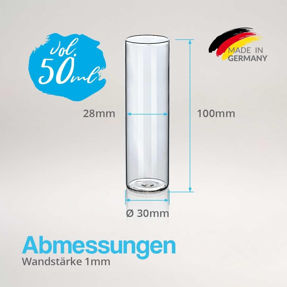 • Abmessungen – Höhe: 100mm / Durchmesser: 30mm / Innendurchmesser: 28mm / Wandstärke: 1mm / Volumen: 50ml