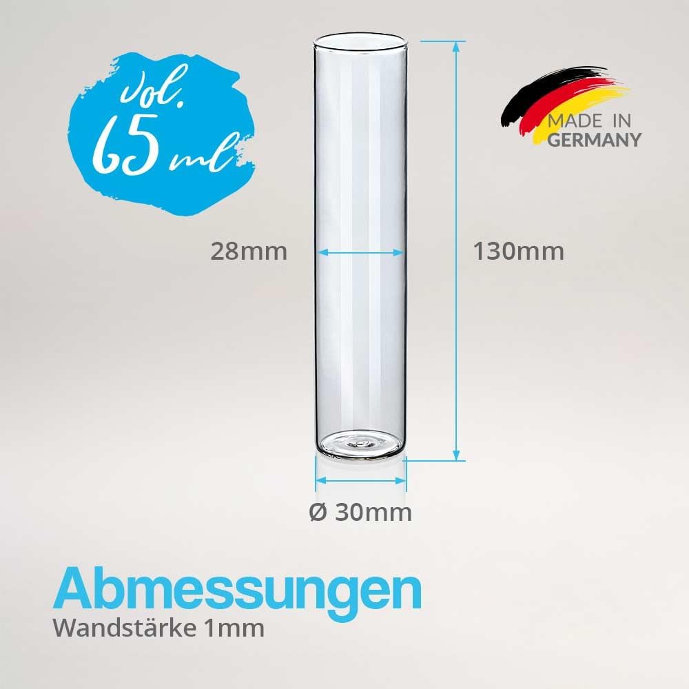 - Abmessungen – Höhe: 130mm / Durchmesser: 30mm / Innendurchmesser: 28mm / Wandstärke: 1mm / Volumen: 65ml