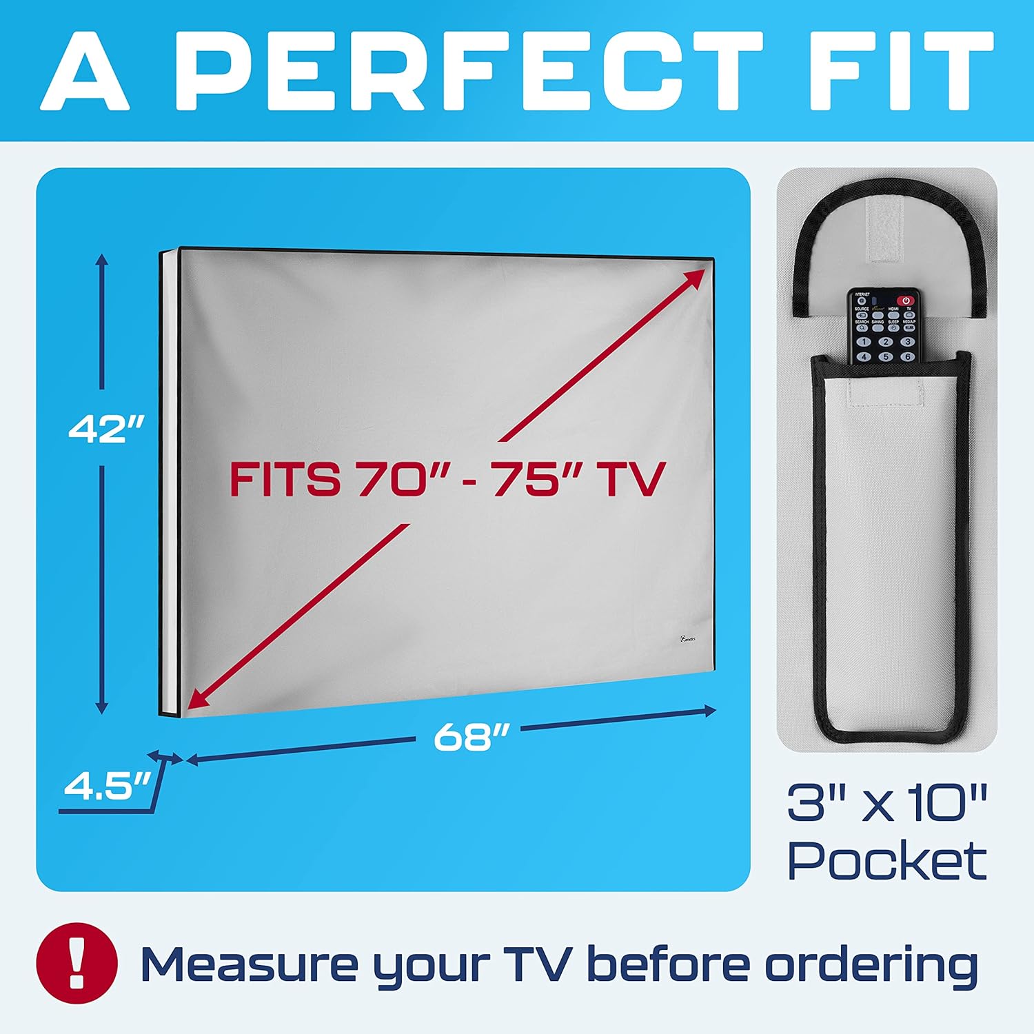 - SPRITZWASSERGESCHÜTZT. Diese TV-Abdeckungen sind sehr wasserbeständig, so dass sie niemanden hereinlassen, auch wenn das Wetter nicht nur leichter Schnee, sondern starker Regen ist. Sie können sicher sein, dass Ihre Ausrüstung intakt bleibt, da das