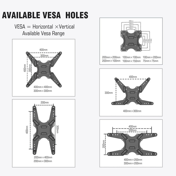 - Weitgehend Kompatibel - Diese TV Wandhalterung ist geeignet für die meisten 26 - 55 Zoll Flach & Curved Fernseher bis zu 40kg. Kompatible VESA: 75x75 / 100x100 / 200x100 / 200x200 / 200x300 / 200x400 / 300x200 / 300x300 / 400x200 / 400x300 / 400x400mm.
