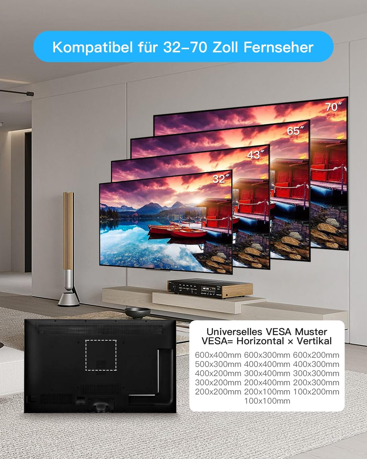 - TV Wandhalterung im Universellen Design - Diese universelle schwenkbare neigbare Halterung Fernseher passt für die meisten 32-70 Zoll Fernseher. Kompatible VESA-Löcher: 600x400 / 600x300 / 600x200 / 500x300 / 400x400 / 400x300 / 400x200 / 300x400 /