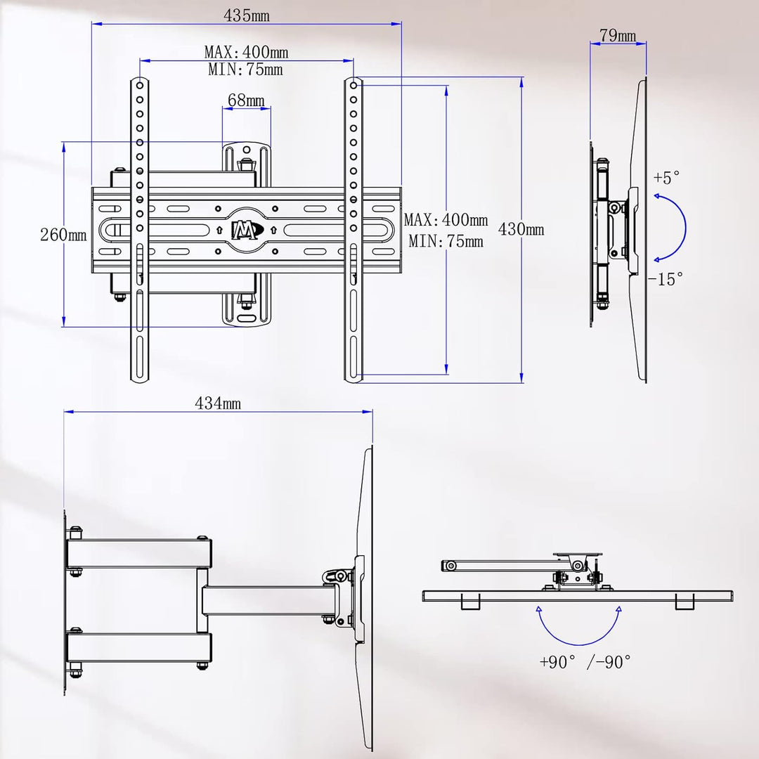 - ORDENTLICH - Das versenkbare Design spart Ihnen wertvollen Platz und sorgt für Ordnung. Der Mindestabstand zwischen dem TV Wandhalterung und der Wand beträgt 79 mm und erstreckt sich von der Wand bis zu einem Maximum von 434 mm.