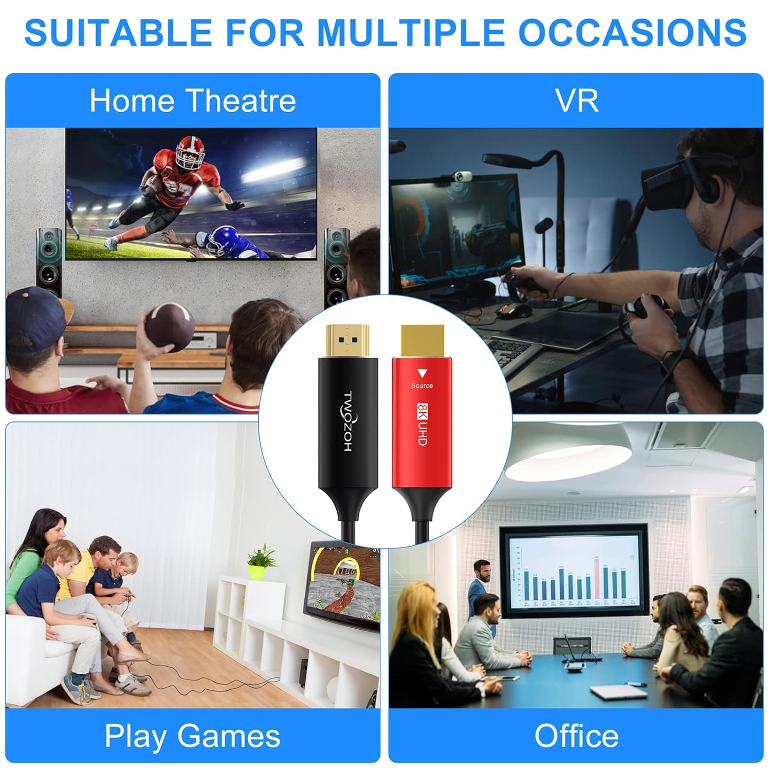 - [Haltbarkeit und flexibel]: Twozoh 8K Glasfaser-HDMI-Kabel mit Glasfaseroptik erreichen längere Distanzen bei hoher Übertragung. 24 K vergoldete Stecker reduzieren das Risiko von EMI/RFI-Hochfrequenzen in Umgebungen mit hoher Störung.