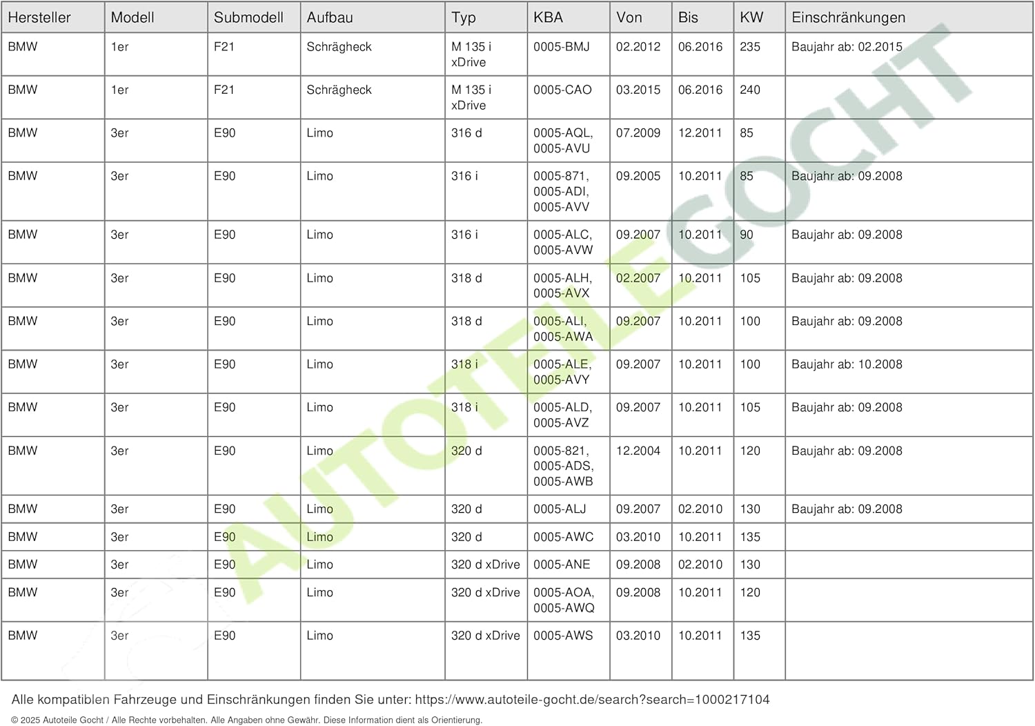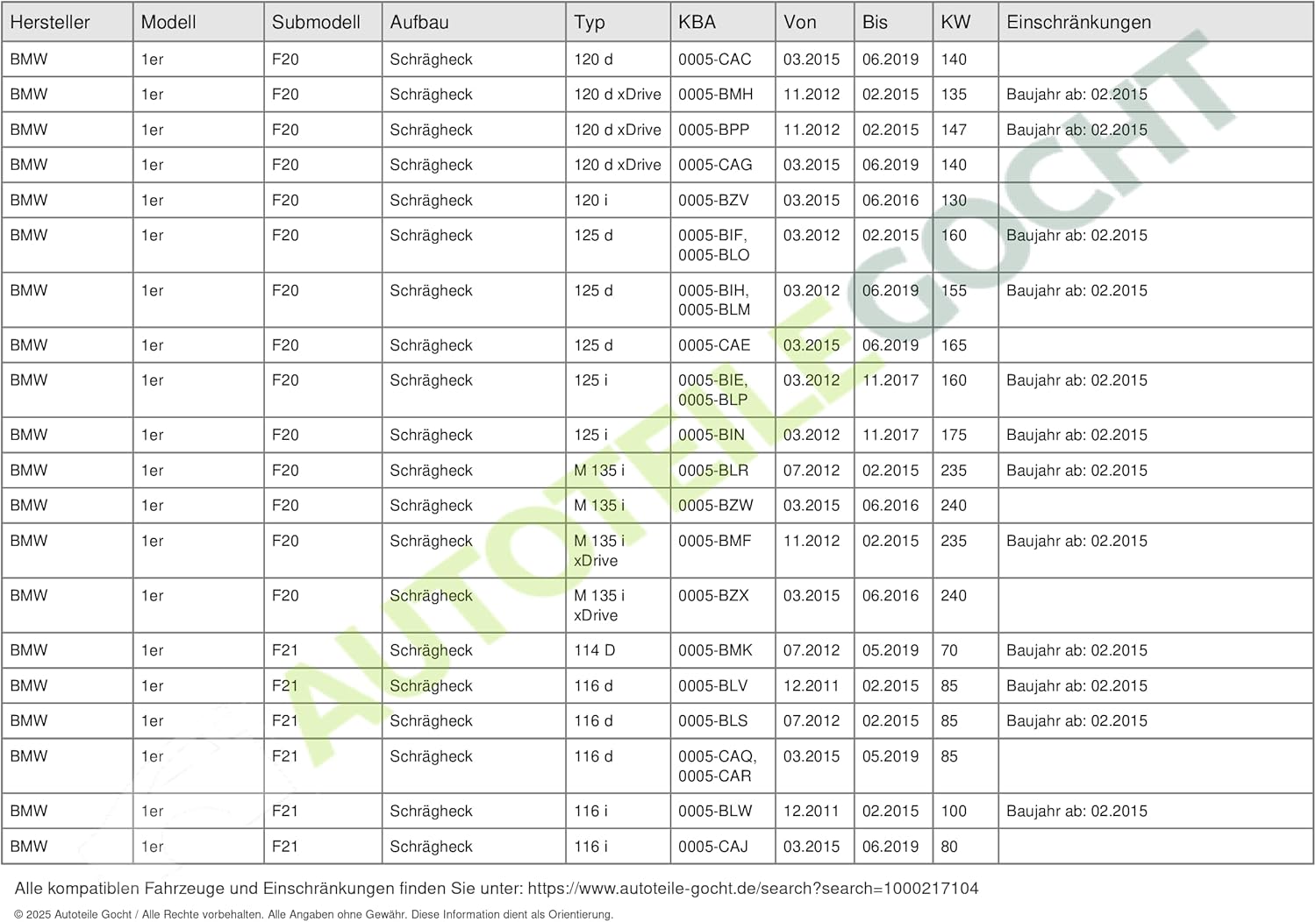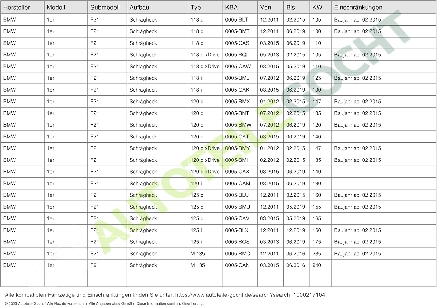 - passend für: BMW 5 (F10), 2979 cm³, 306 PS (225 kW), 1/2010 bis 10/2016, KBA-Nr: 0005ATC,BMW 7 (F01, F02, F03, F04), 2979 cm³, 326 PS (240 kW), 9/2008 bis 6/2012, KBA-Nr: 0005ANP,BMW X1 (E84), 1997