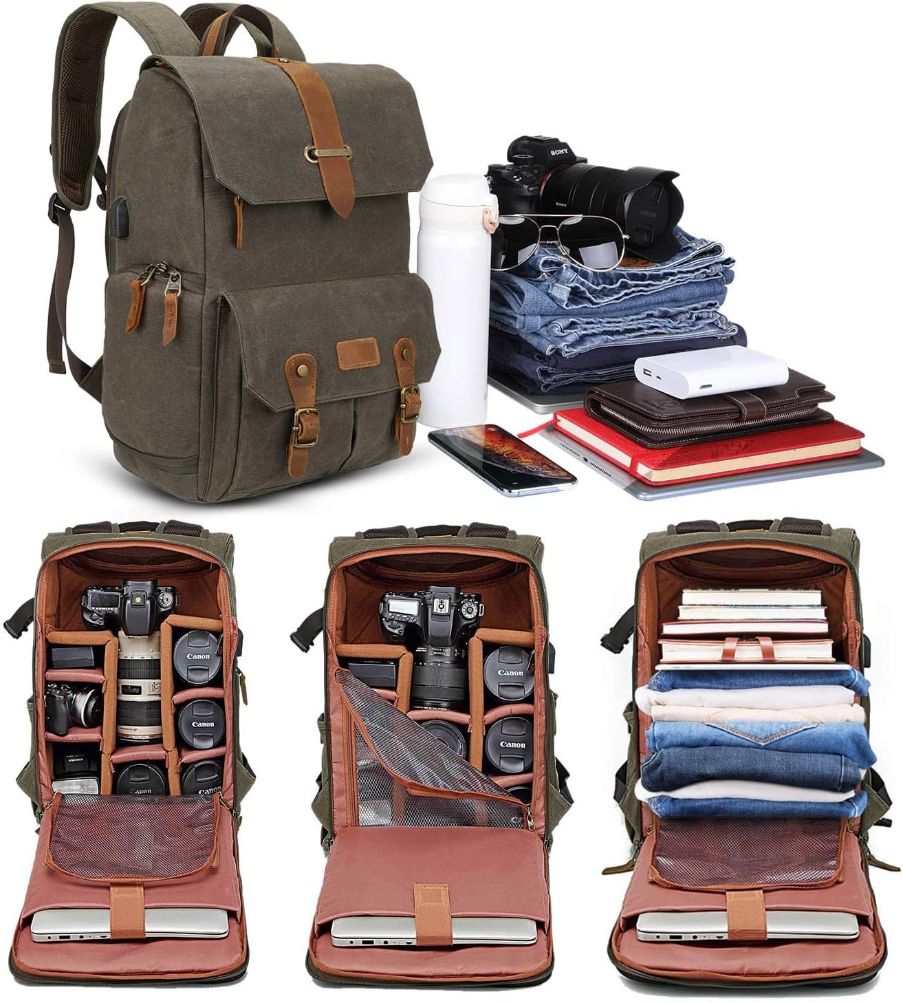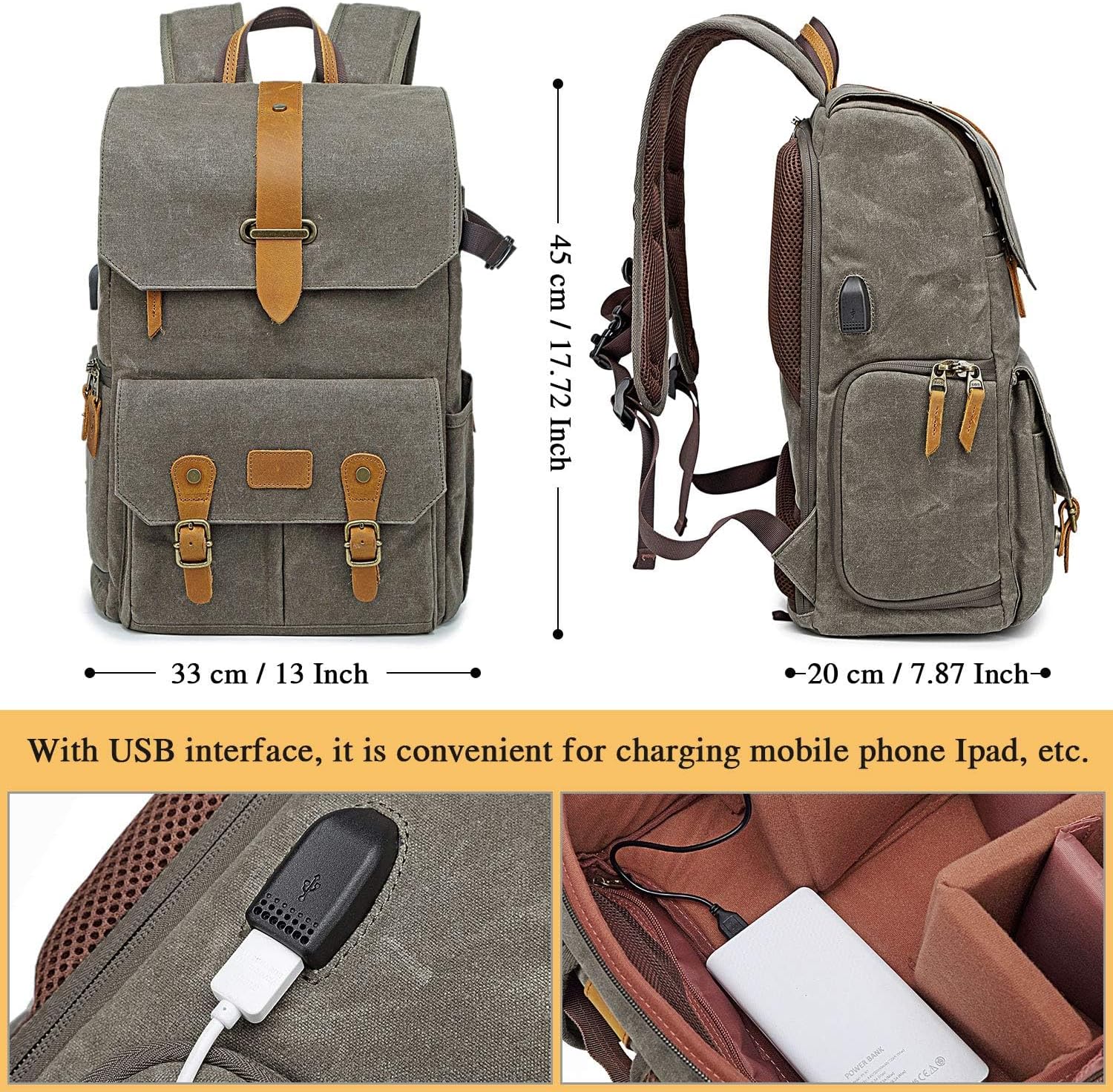 - ✅【Grosse Kapazität Vintage Kamerarucksack】 --- Unser Canvas DSLR Rucksack verfügt über zwei separate Fächer für Kamera, Laptop und andere Notwendigkeiten. Mit Abmessungen von 45 x 33 x 20 cm (17,72 x 13 x 7,87 Zoll) für einen 15,6 Zoll Laptop. Passt perfekt zu Kamera, Objektiv, Blitz, Ladegerät, Ersatzakku usw.