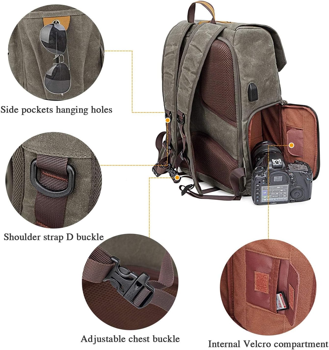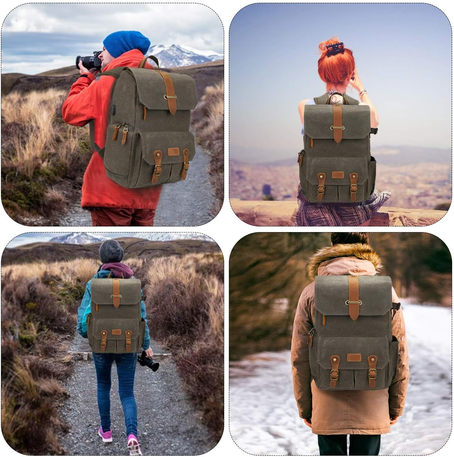 - ✅【Stilvolles Retro Design, wasserdicht und abriebfest】 --- Unser Vintage-Kamerarucksack aus wasserdichtem und strapazierfähigem, gewachstem Canvas und echtem Leder verleiht ihm ein sehr stilvolles Aussehen, das niemals in den Trend fallen kann. Das Gummikissen am Boden ist rutschfest, staub- und abriebfest und macht die fotorucksack langlebiger.