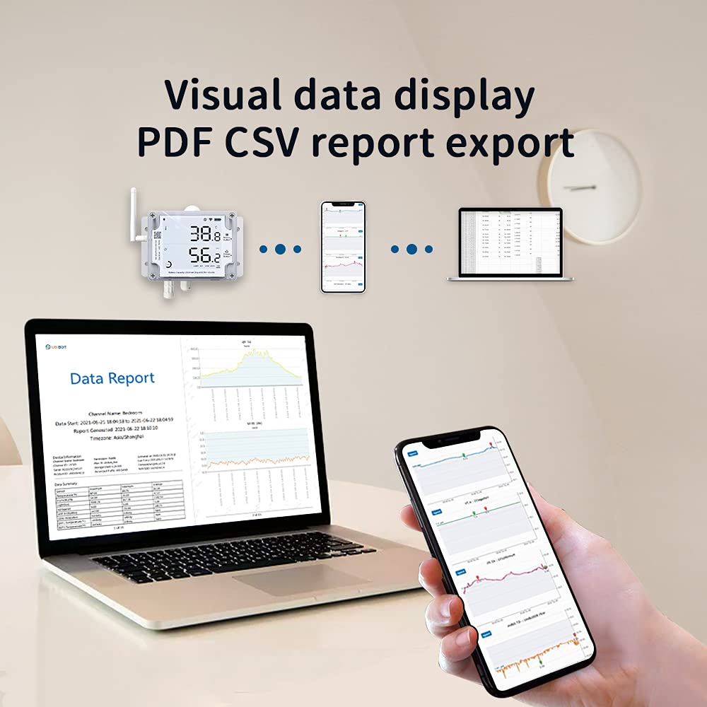 - 24/7-Fernüberwachung. Kostenlose Verlaufsverfolgung. Kostenloser 200 MB Cloud-Speicher, der Daten bis zu 2 Jahren speichern kann. Online-Daten können in PDF- oder CSV-Dateien heruntergeladen werden. Das Gerät verfügt ausserdem über einen grossen internen Speicher, der bis zu 300.000 Daten speichern kann, um sicherzustellen, dass keine Lücke im Verlauf entsteht, wenn das Netzwerk ausfällt.