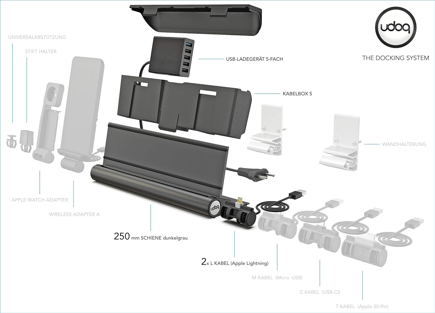 - APPLE LADESTATION mit Apple Lightning Kabeln | Die Ladestecker und ein 5-fach USB Netzteil mit Quick Charge Funktion befinden sich in der Kabelbox auf der Rückseite der Docking Station