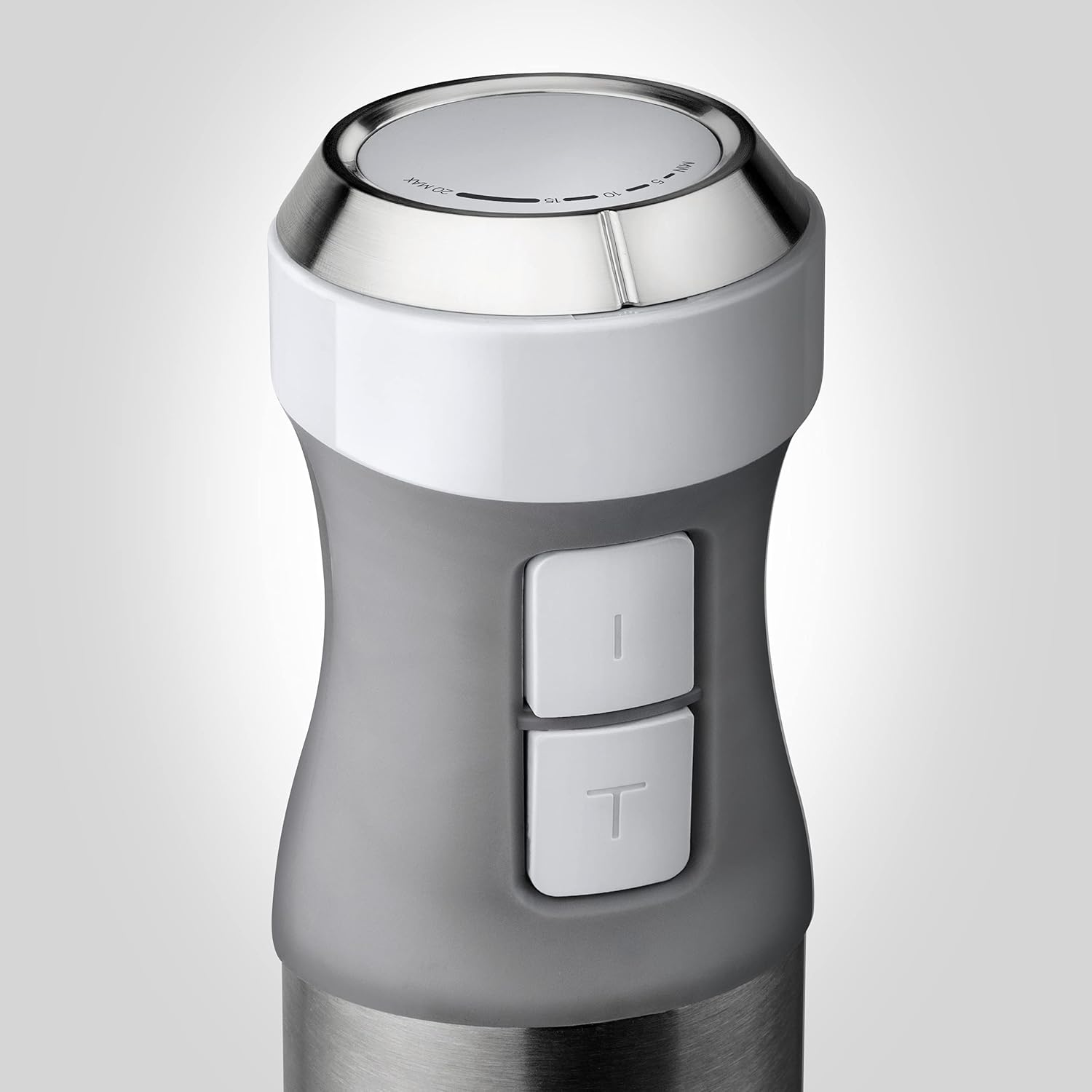 - LEISTUNG UND GESCHWINDIGKEITEN. BPA-freier Minipimer mit 1000 W Leistung, TURBO-Funktion und 20 einstellbaren Geschwindigkeiten für die Verarbeitung aller Arten von Lebensmitteln.
