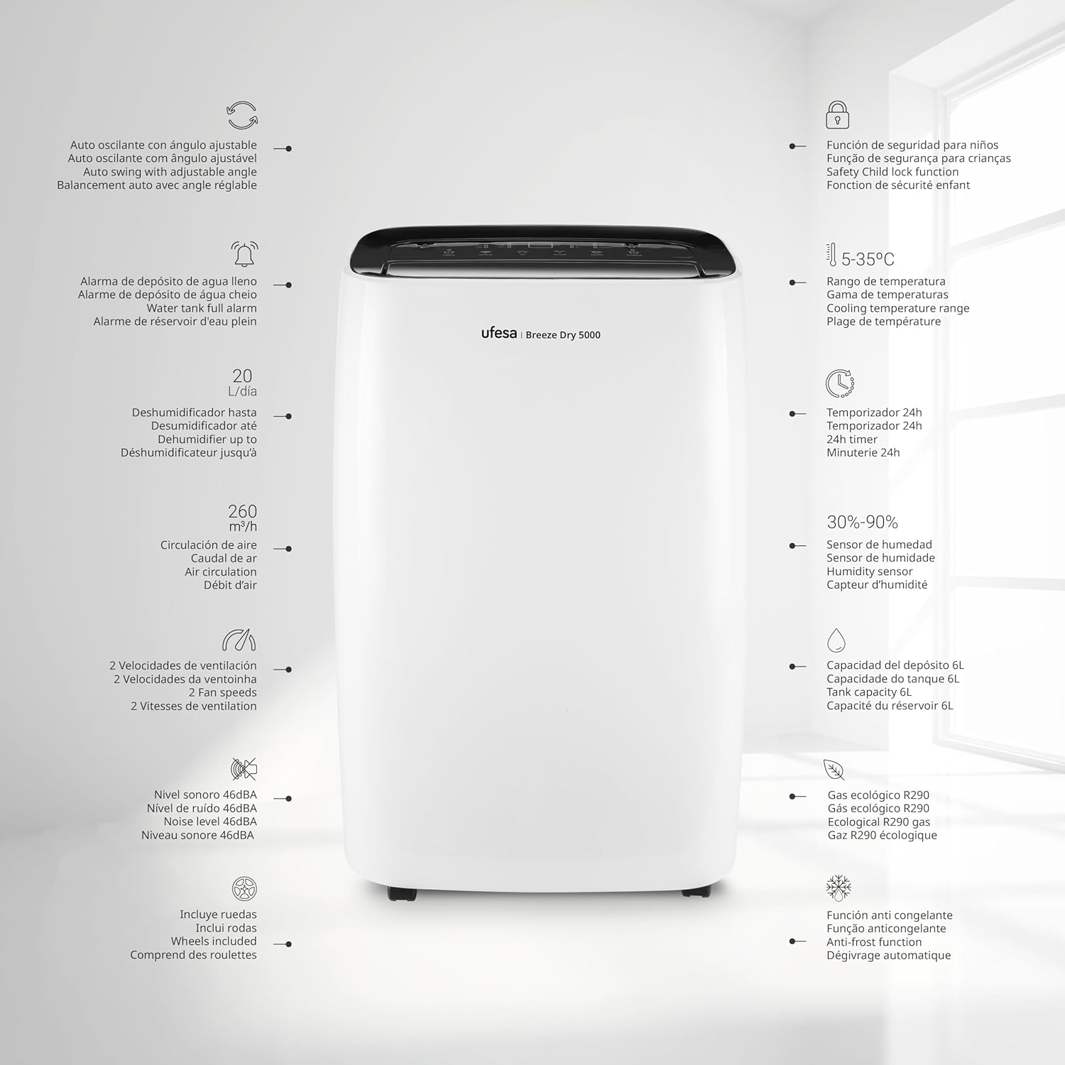 - HAUPTFUNKTIONEN UND MERKMALE. Leise mit nur 46 dB, mit intuitivem Bedienfeld, 6-Liter-Tank und 2 Gebläsestufen. Er hat eine Luftzirkulation von 260 m3/h und eine Betriebstemperatur von 5 bis 35ºC, automatische Oszillation mit einstellbarem Winkel zur