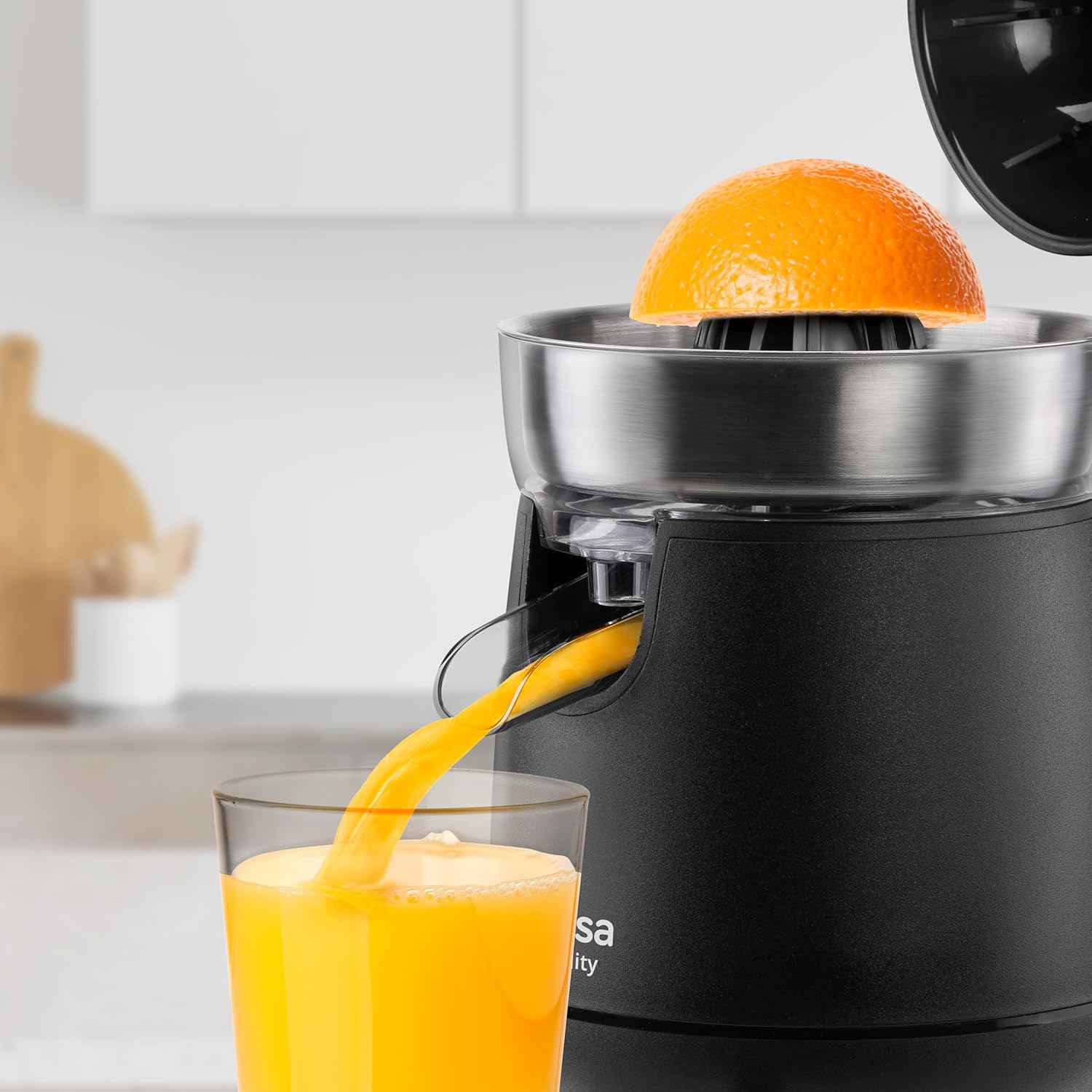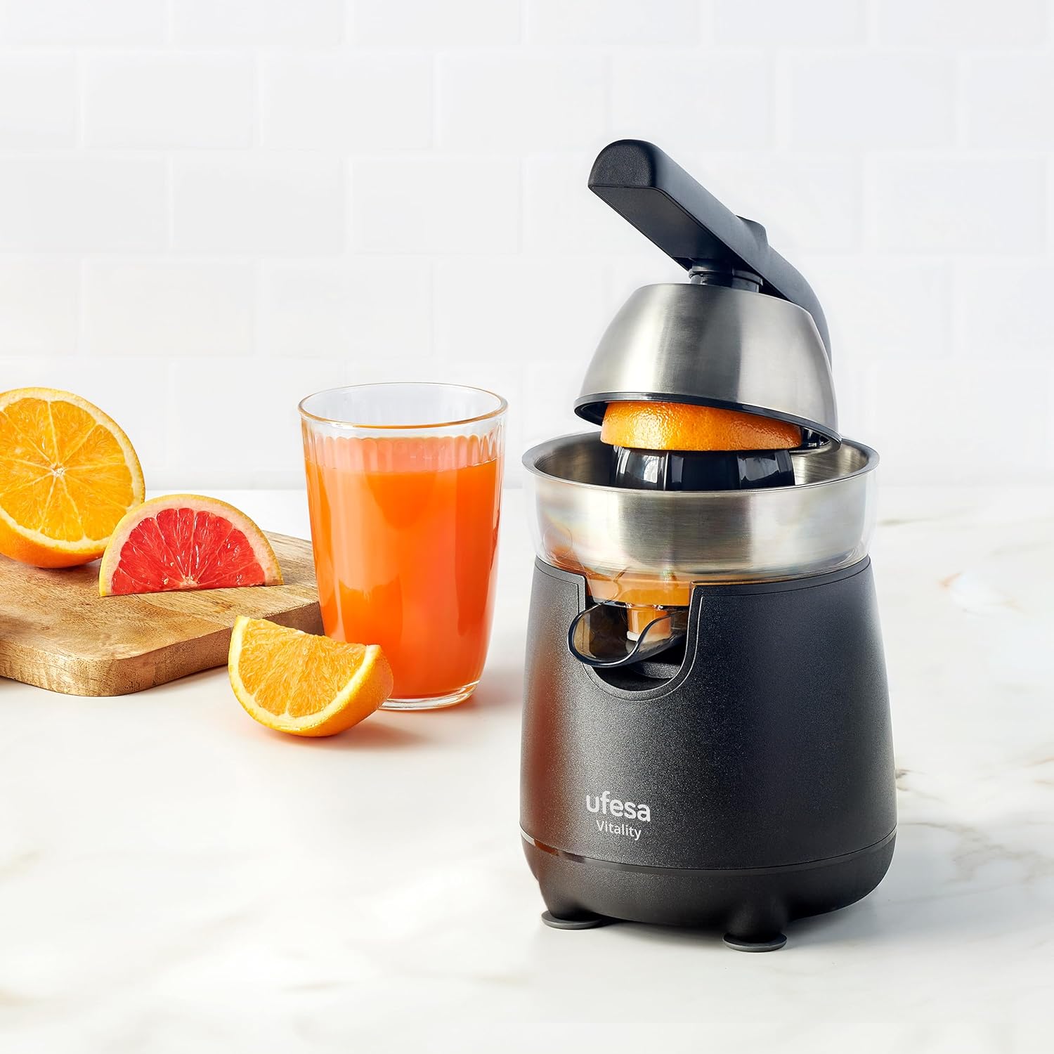 - LEISTUNG UND DESIGN. Motor mit 120W, der es dir ermöglicht, Säfte schnell und mühelos zuzubereiten. Sein Gehäuse aus Edelstahl gewährleistet Langlebigkeit und ein modernes Design, das jede Küche ergänzt. Geniesse deine Lieblingszitrusfrüchte auf
