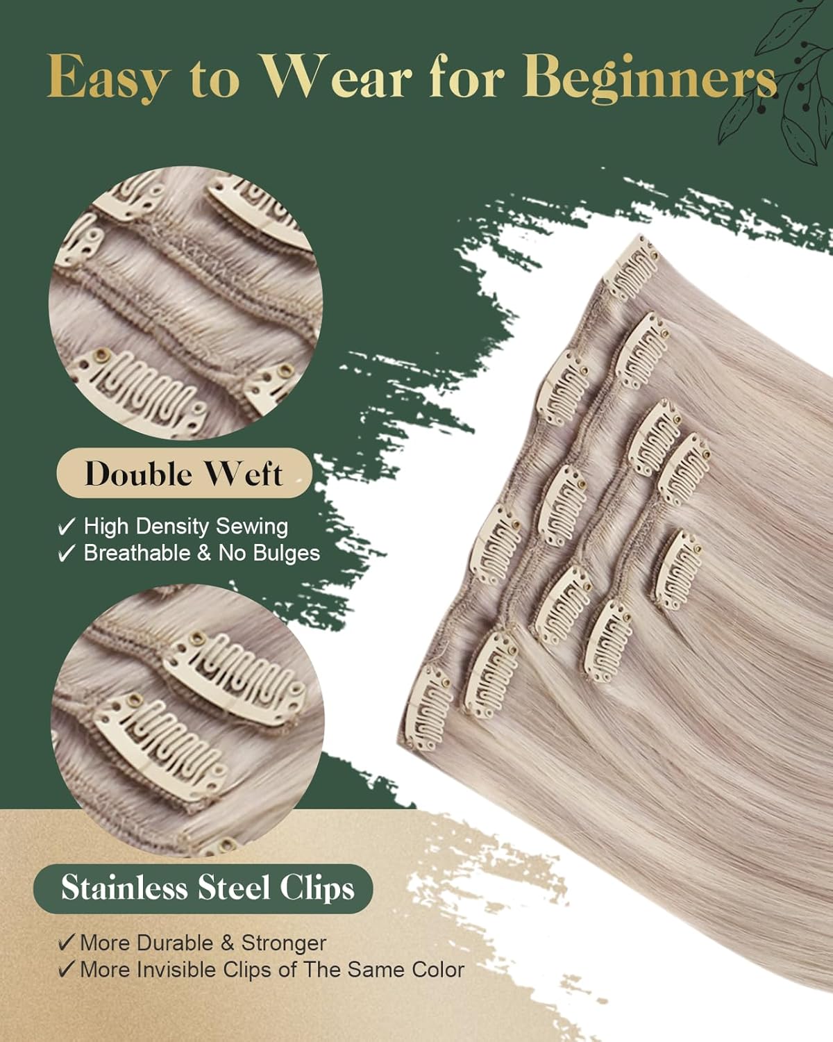 - [ Edelstahl-Metallclips mit einzigartigem U-förmigem Design ] Die U-förmigen Metallclips reduzieren das Reissen und sorgen für ein bequemes und langlebiges Tragegefühl. Für zusätzliches Volumen empfehlen wir 1 Set, während 2 Sets einen vollen Kopf