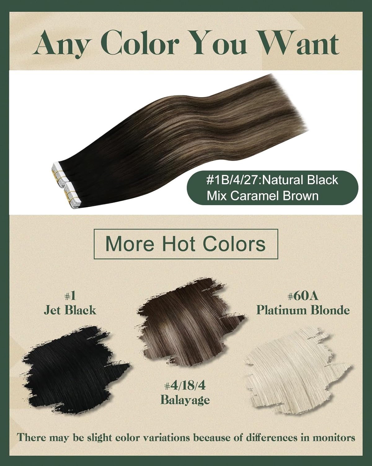 - 【Spezifikation】Aus Schwarz Zu Kastanienbraun Und Erdbeer Blonde - Tape in Haarverlängerungen sind 12-24 Zoll, 20 Stück pro Packung. 12 Zoll wiegt 30g, 14-24 Zoll wiegt 50g. Je nach Länge wiegt jedes Stück zwischen 1,5 und 2,5 g, so dass es sich