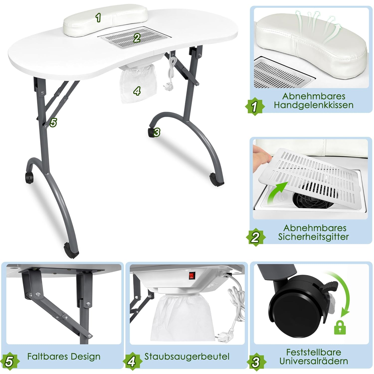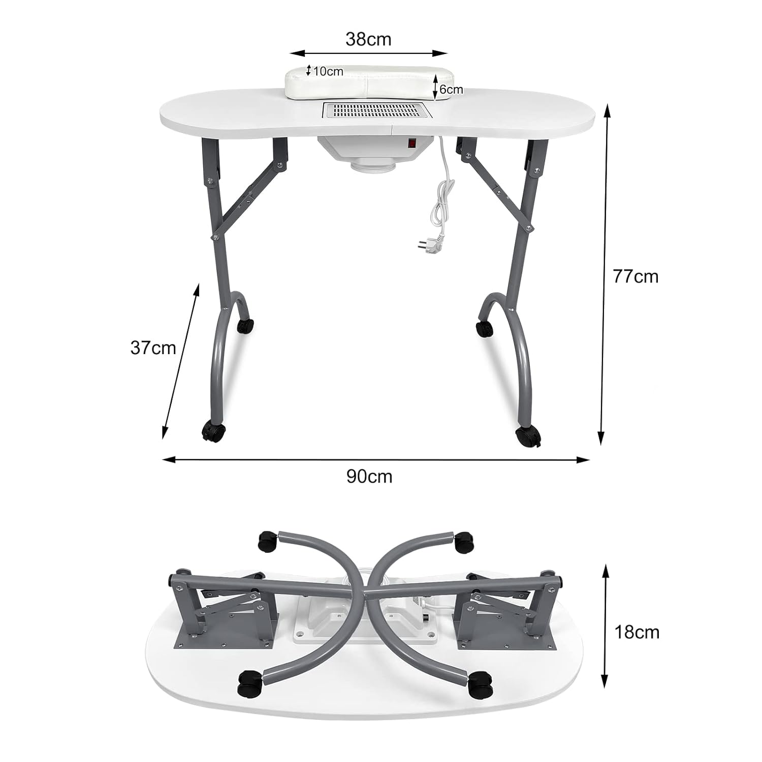 - 👍 Faltbarer Maniküretisch: Masse : 90 x 37 x 77 cm; Gefaltete Masse: 90 x 37 x 18 cm; Saugleistung: 4500 U / min; Stromverbrauch: 17 W; Schalldruckpegel: 55 db. Die geräumige Tischplatte bietet Ihnen viel Platz.