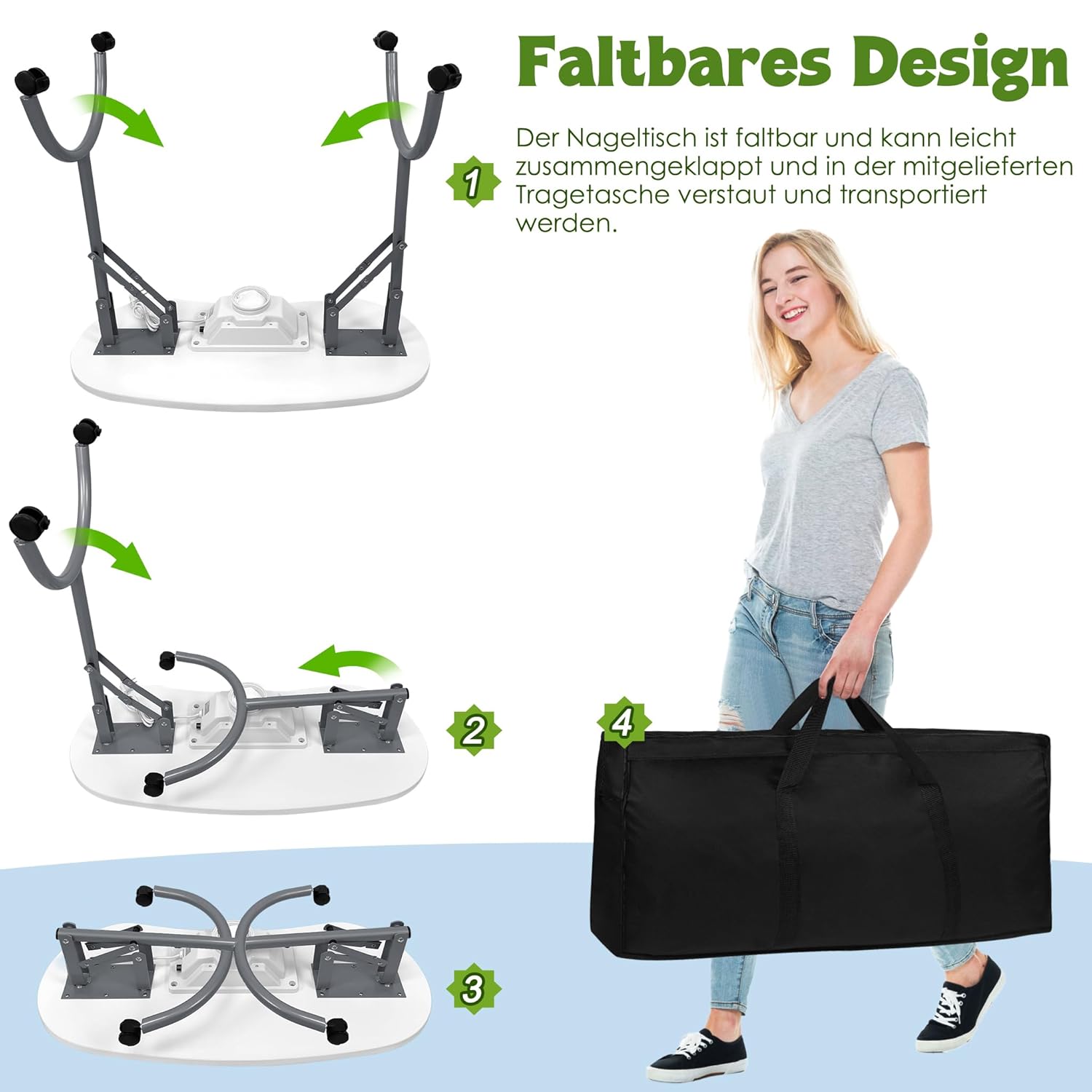 - 👍 Einfache Anwendung: Maniküretisch lässt sich schnell aufbauen und zusammenklappen, und das minimalistische Design passt zu jeder Einrichtung. Ideal für Nagelstudios, Kosmetikstudios und Schönheitssalons.