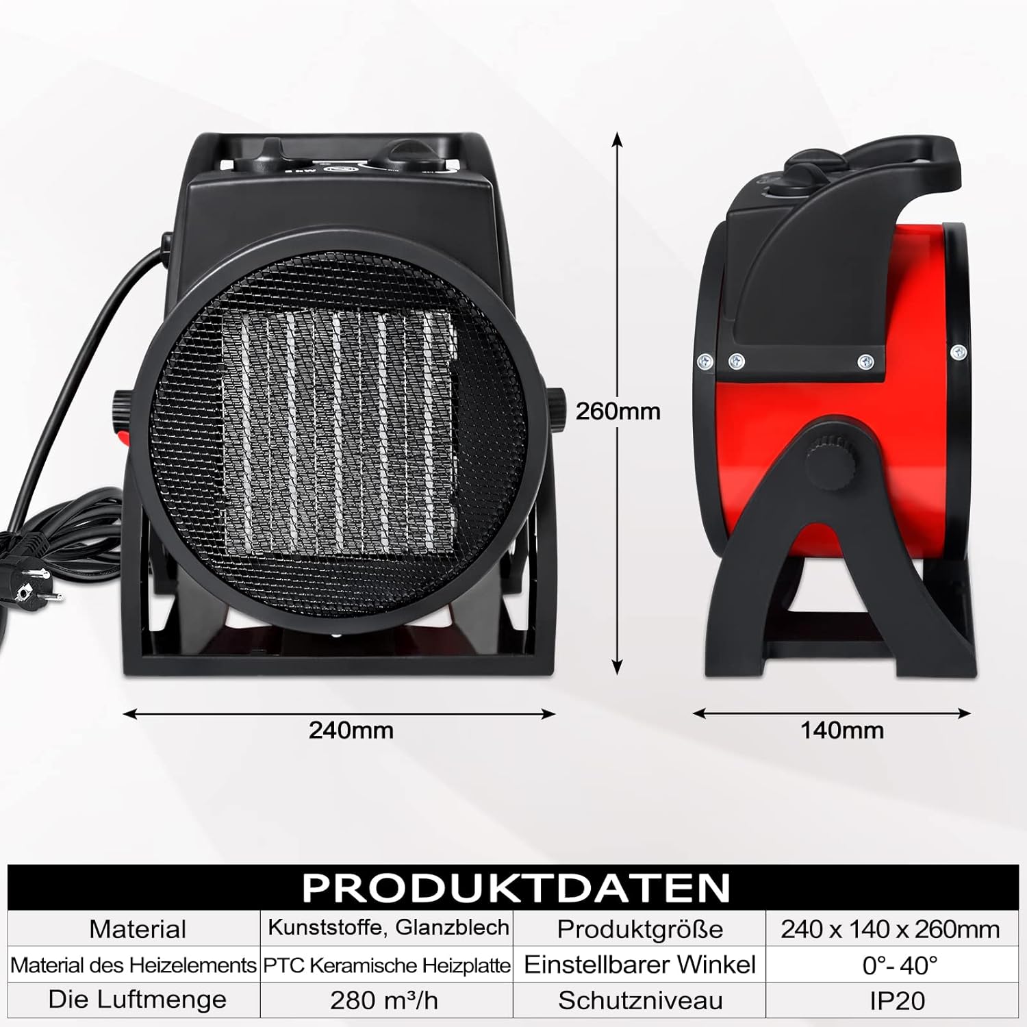 - 🔥【PTC Keramik Heizlüfter 】Gerätemasse: ca. 240 x 140 x 260mm; Nennleistung: 3000 Watt; Heizelement-Material: PTC Keramische Heizplatte; Netzkabellänge: ca. 140cm; Mit rutschfester Befestigungshalterung