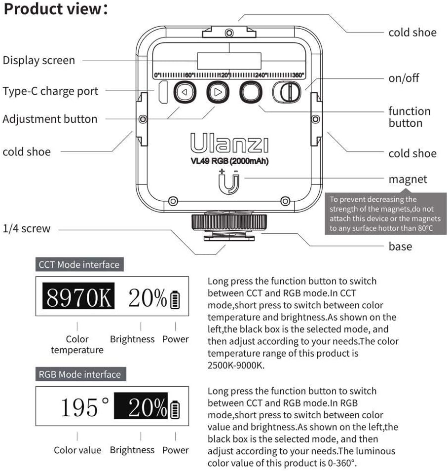 Ulanzi VL49 RGB Mini Multi Color LED Videolampe für Smartphone und Kamera Fülleuchte mit einstellbar