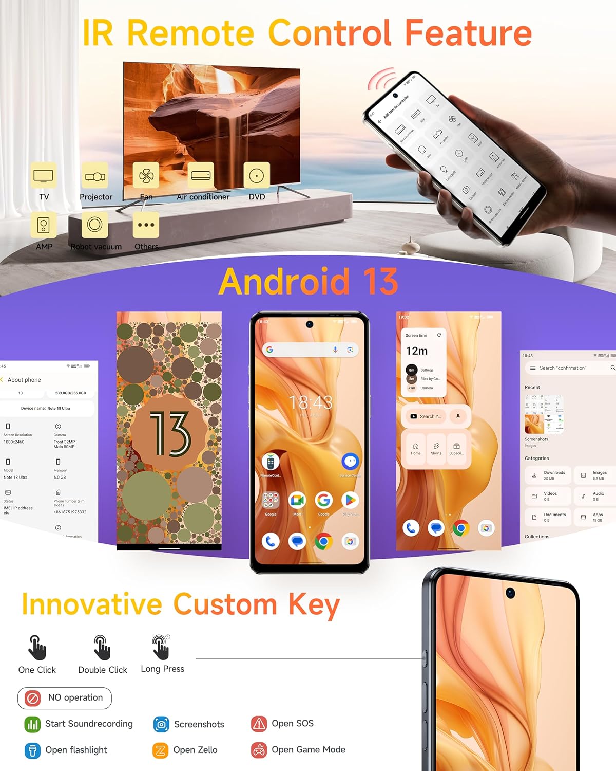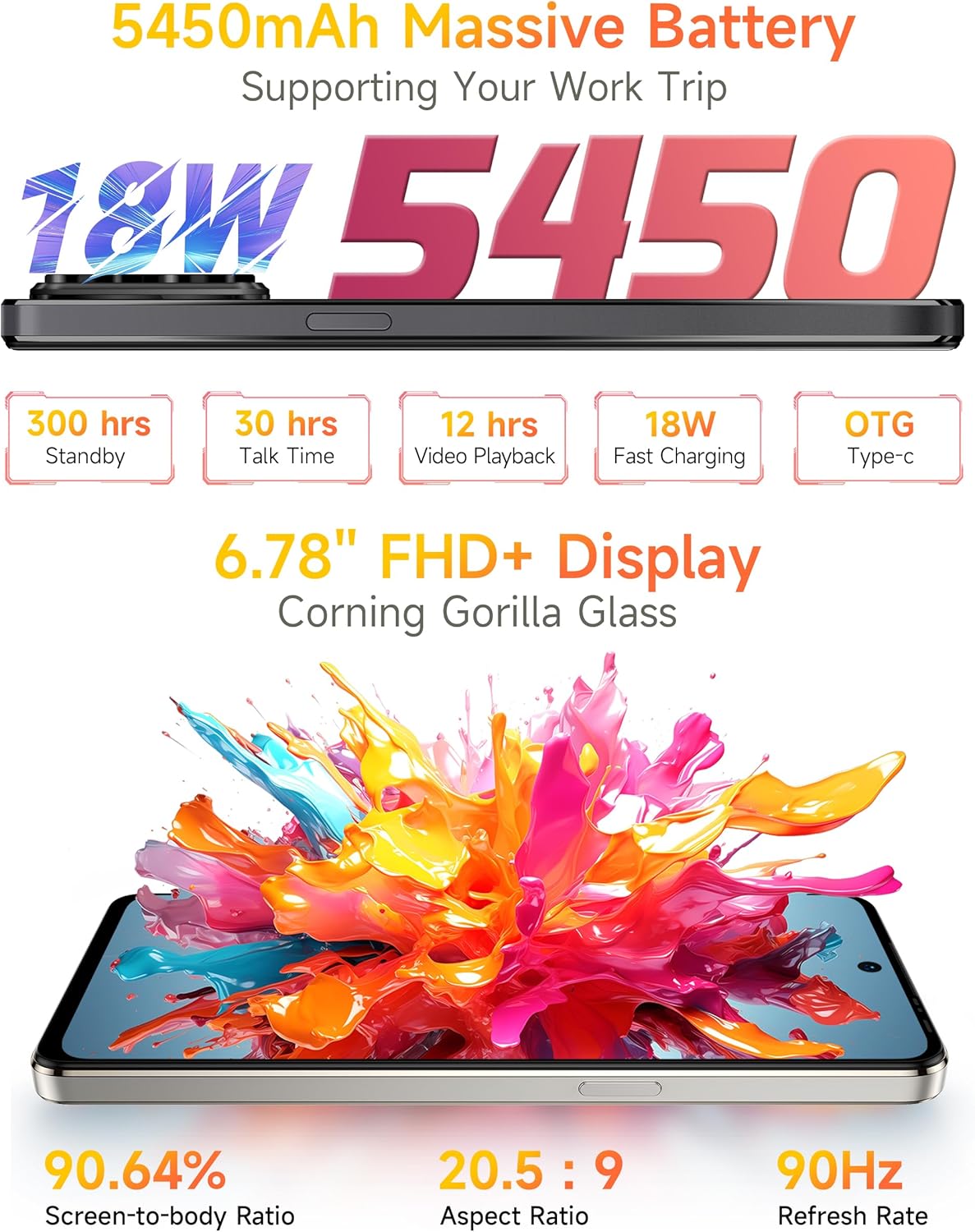 - 6,78" FHD+ & 90Hz Display:Ausgestattet mit einem grossen 6,78 Zoll FHD+ Display mit einer Auflösung von 1080*2460 Pixeln, einem Seitenverhältnis von 20,5:9 und einer Bildwiederholfrequenz von 90Hz bietet dieses Note 18 Ultra Smartphone ein