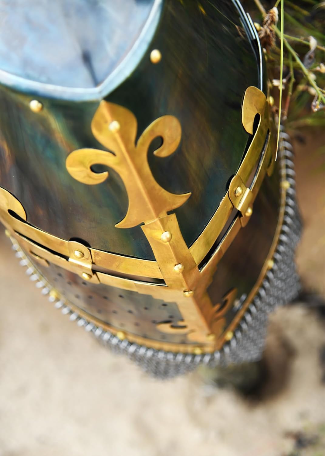 • Dieser grosse Topfhelm ist eine Nachbildung eines spätmittelalterlichen Funeralhelmes der Familie Rieter von Kornburg aus der Allerheiligenkirche Kleinschwarzenlohe.