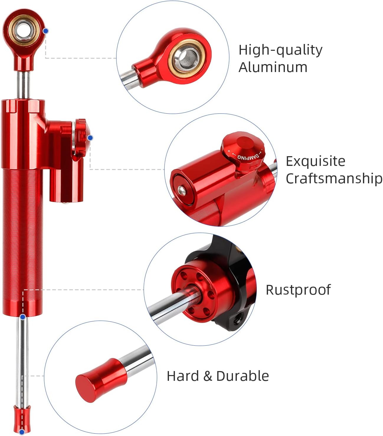 - 【Premium Material und Technologie】: Dieser Lenkungsdämpfer ist aus hochwertigem Aluminium gefertigt, die Oberfläche ist eloxiert, rostfrei, antioxidativ, stark, nicht leicht zu altern und zu verschleissen, was eine ausgezeichnete Stabilität und