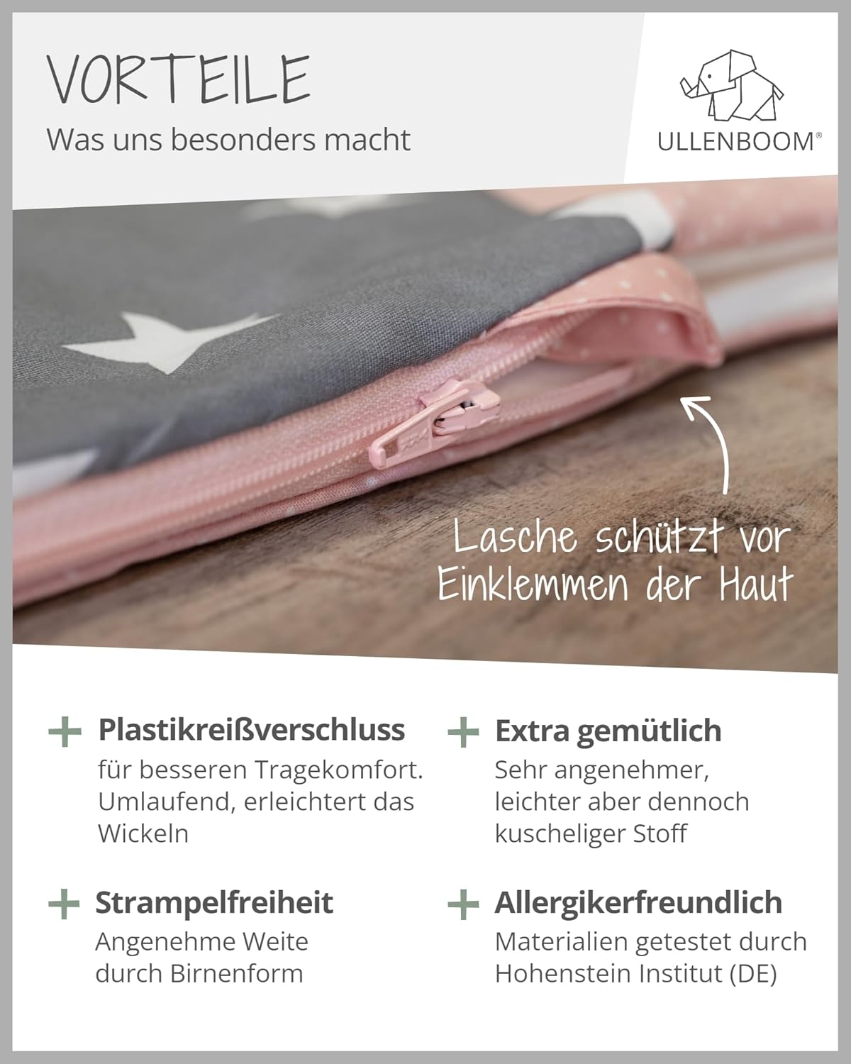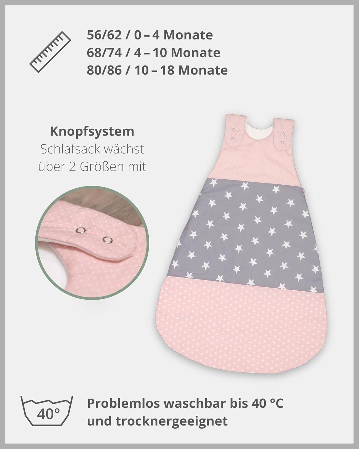 ULLENBOOM ® Schlafsack Baby 10 bis 18 Monate, 80/86, Rosa Grau (Made in EU) - Baby Schlafsack Neugeb