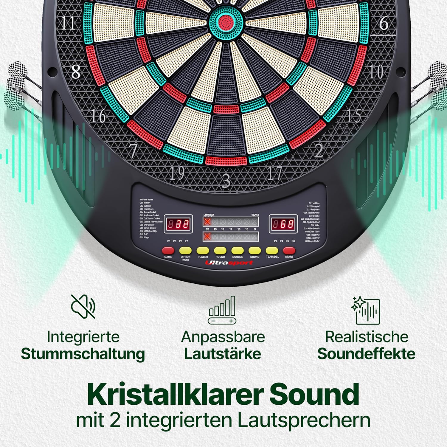 - LEISTUNGSSTARKES LED-DISPLAY: Neben einem Display, das den Punktestand anzeigt, verfügt das Classic Dartboard auch über interaktive Soundeffekte und eine Sprachausgabe. Das Board kann auch Töne wie bei einem echten Dartspiel abspielena