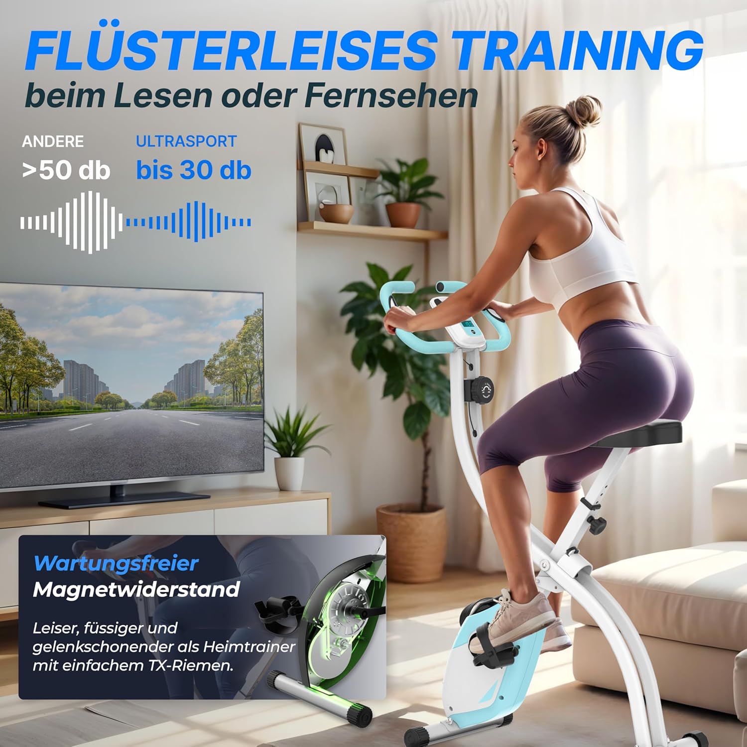 • Klappbarer Fahrrad-Heimtrainer, Hometrainer, Fitnessbike mit 8 Widerstandsstufen, schnell & leicht auf- und abzubauen - das Original, entwickelt vom F-Bike Marktführer Ultrasport