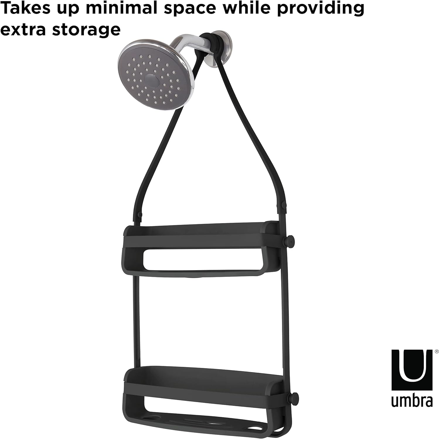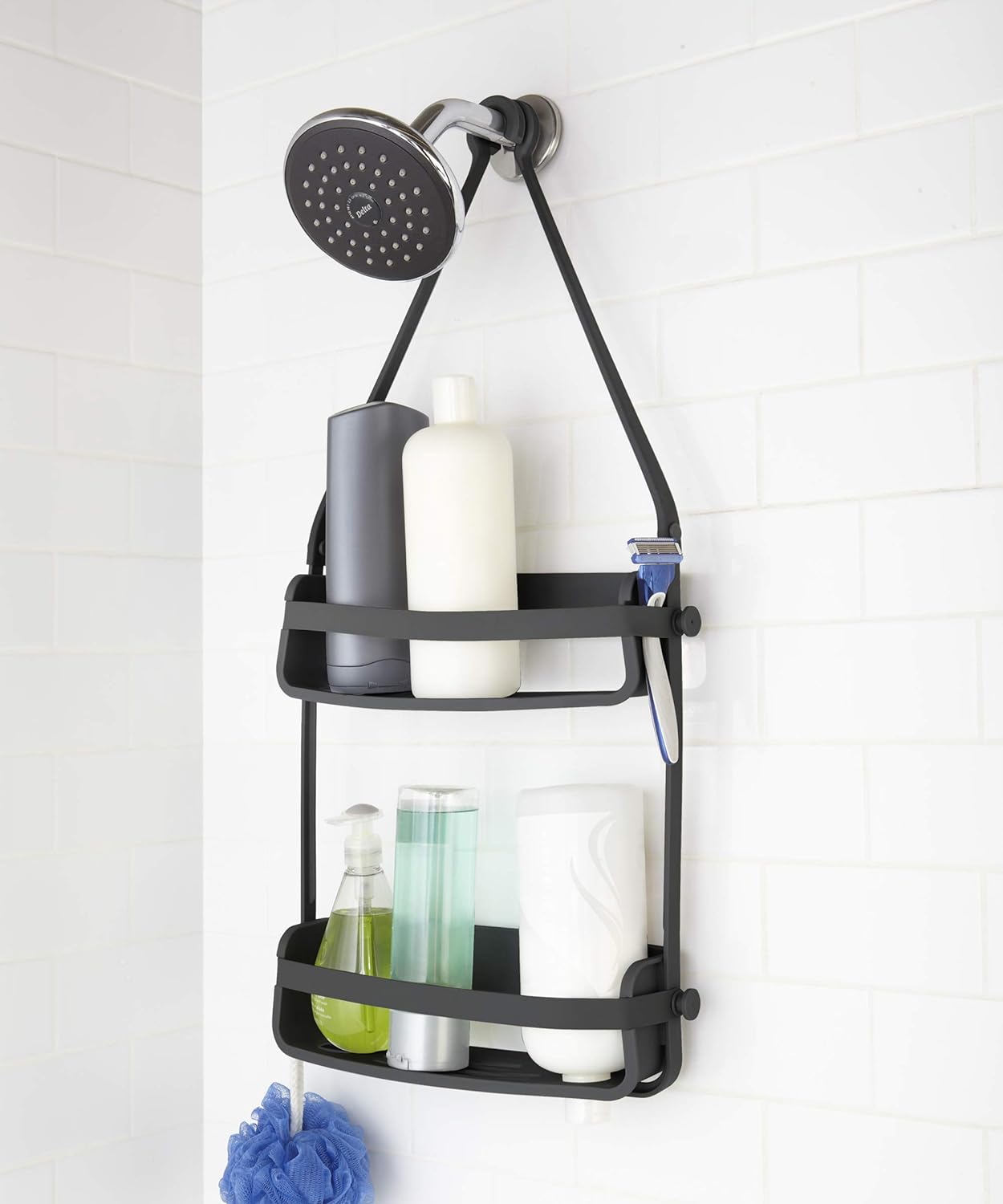 - FUNKTIONAL & MODERN: Die Flex-Duschablage hat zwei extra breite Ablagen und flexible Gummibänder, die bis zu vier grosse Shampoo-Flaschen halten; verwenden Sie die vier Öffnungen in den Ablagen, um Ihre Flaschen umgedreht zu lagern, so dass die