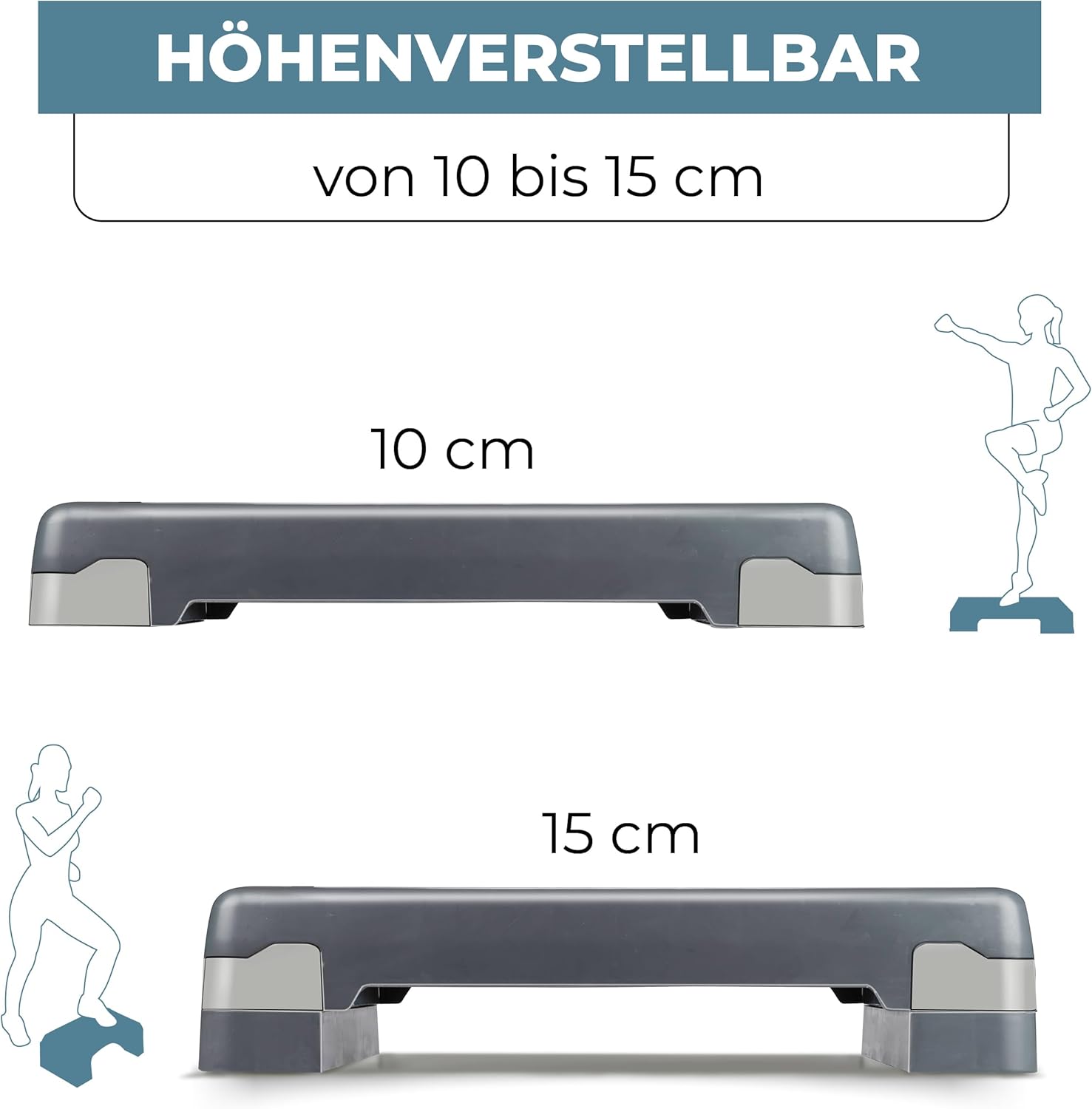 - HÖHENVERSTELLBAR - Um sicherzustellen, dass der Aerobic Step für verschiedene Altersgruppen und Sportniveaus geeignet ist, verfügt er über zwei verschiedene Stufenhöhen. Ohne Beine hat die Fitness-Stufe eine Höhe von 10 Zentimetern. Durch Hinzufügen der Beine an der Unterseite der Stufenbank können Sie diese auf eine Höhe von 15 Zentimetern anheben.
