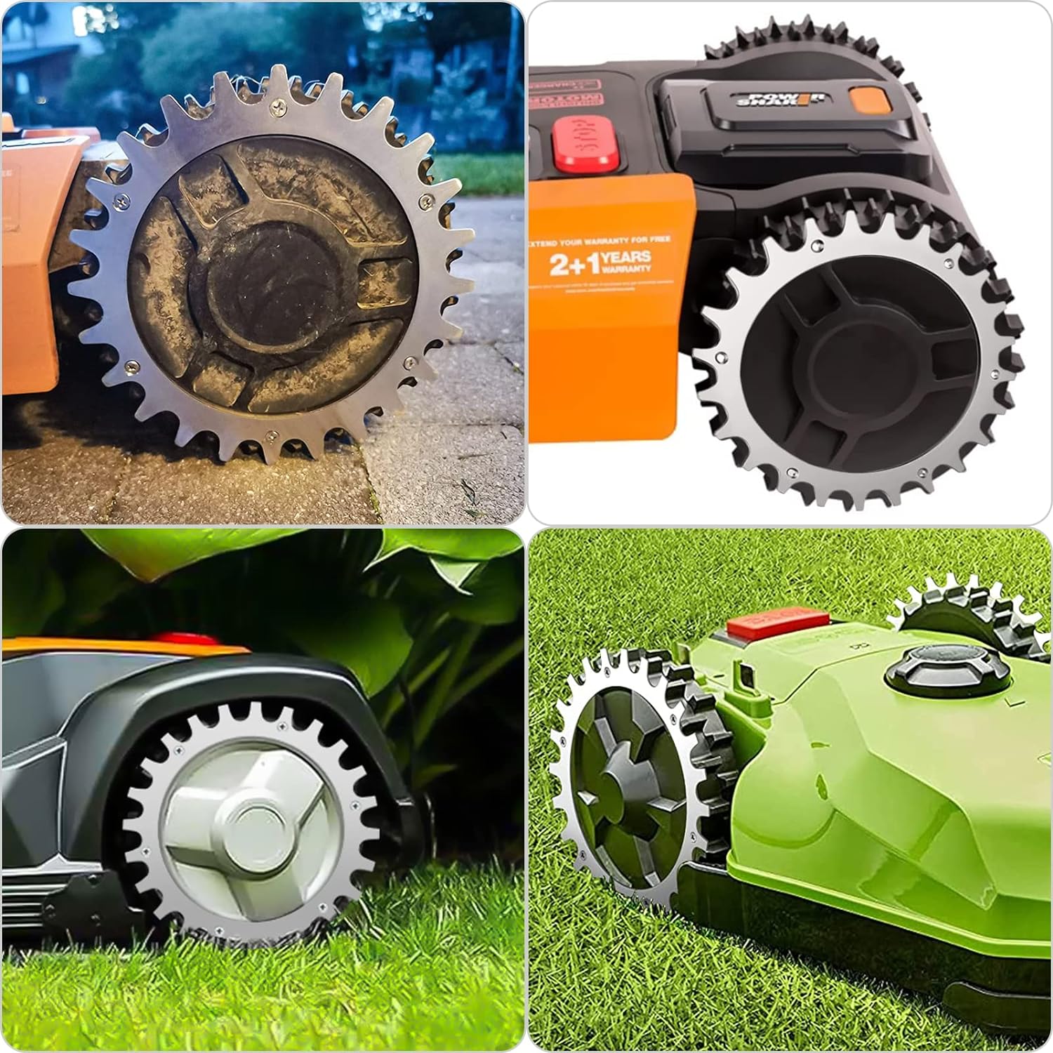 • ✅【Traktionsverbesserung】 Wenn der Mähroboter auf nassen Rasenflächen oder steilen Hängen arbeitet, können unsere Spikes ihm eine bessere Traktion verleihen, wodurch er effektiv daran gehindert wird, zu graben und Blätter im Rasen zu