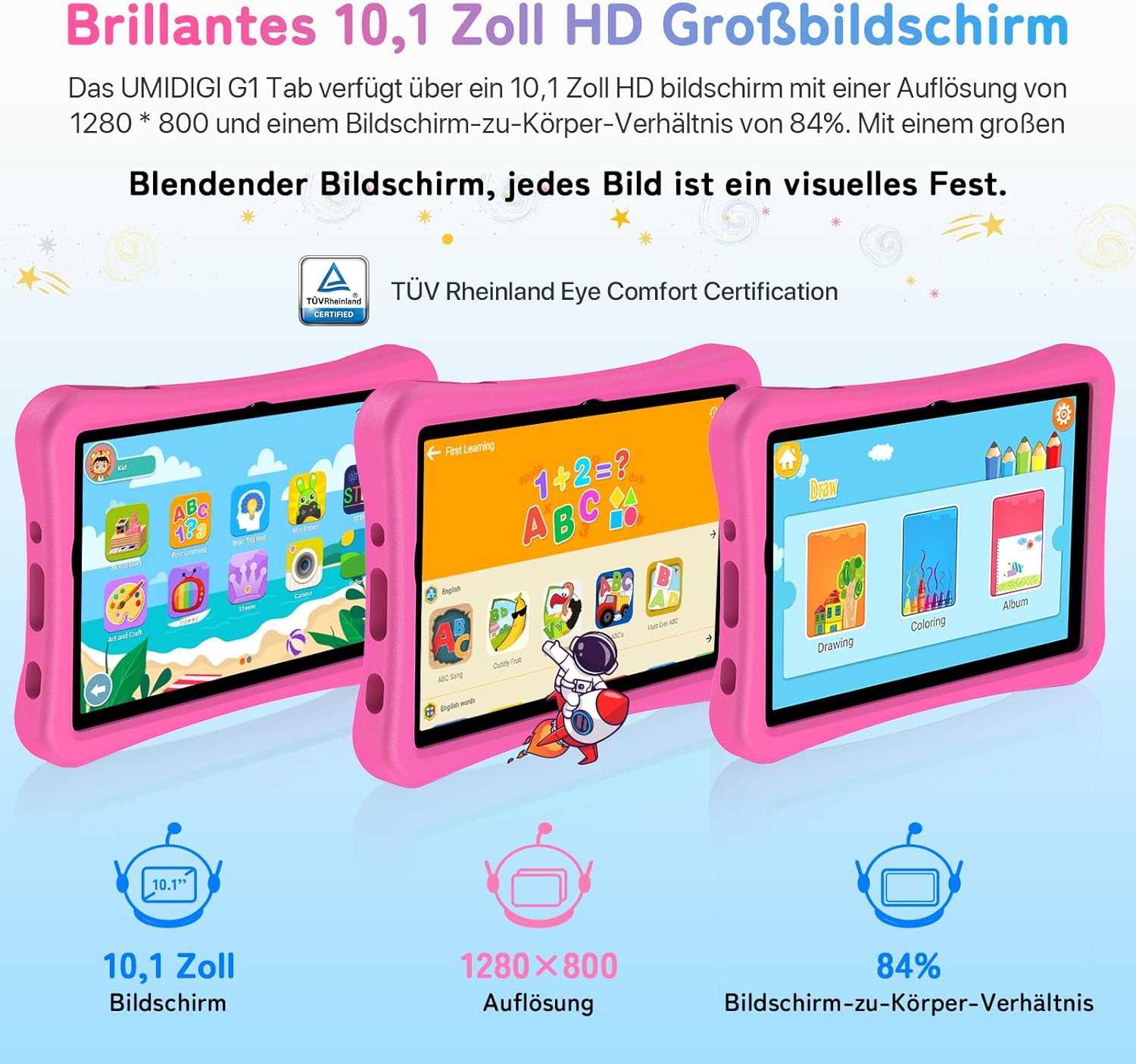 - 10,1 Zoll HD& Augenschutz: UMIDIGI G1 Tab Kids Tablet hat ein 10,1-Zoll 1280*800 hochauflösendes Display, Kinder sind in der Lage, Filme zu sehen, Spiele zu spielen, und lesen Sie Bücher mit scharfen und lebendigen Bildern und Videos. Durch die