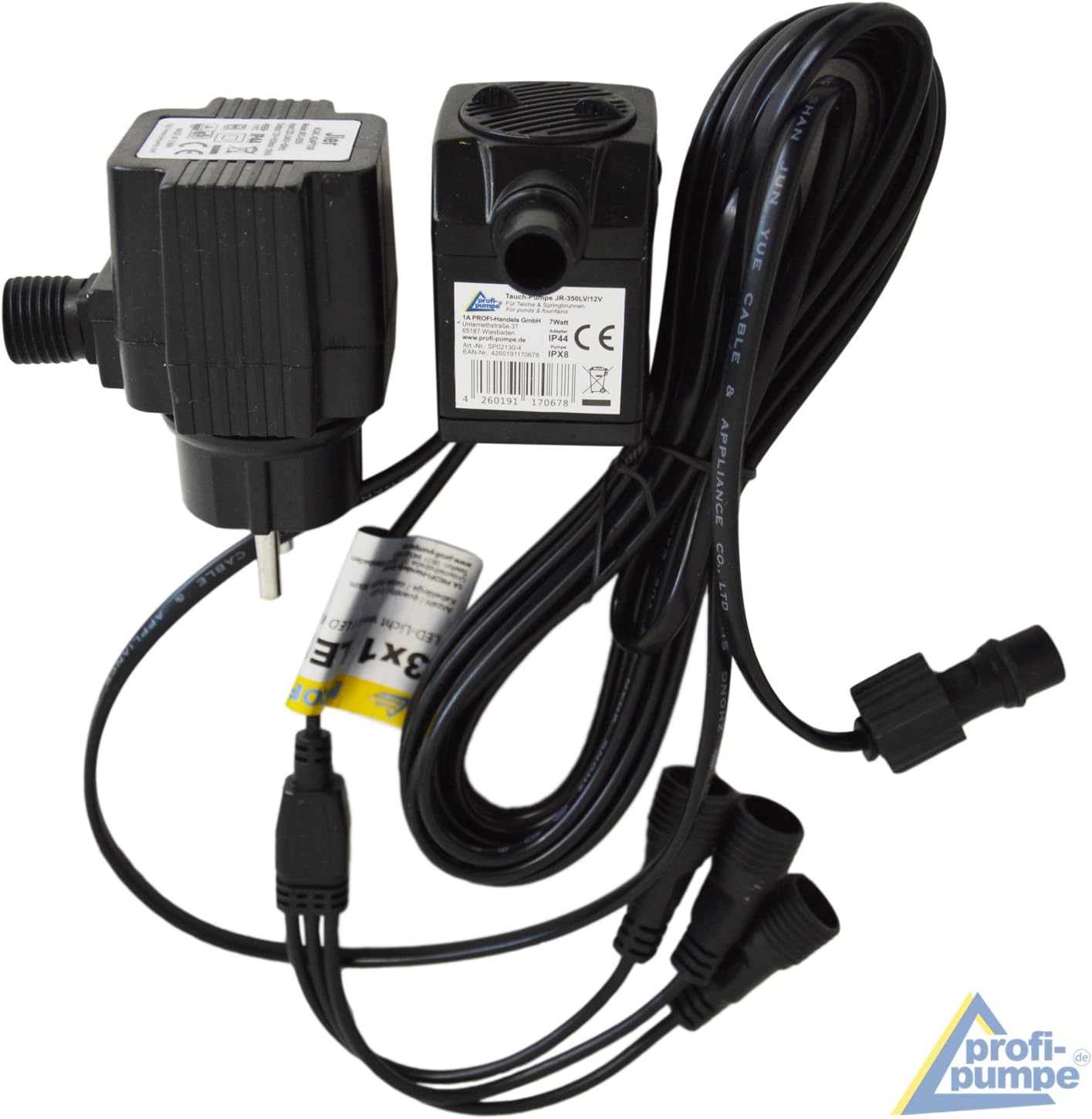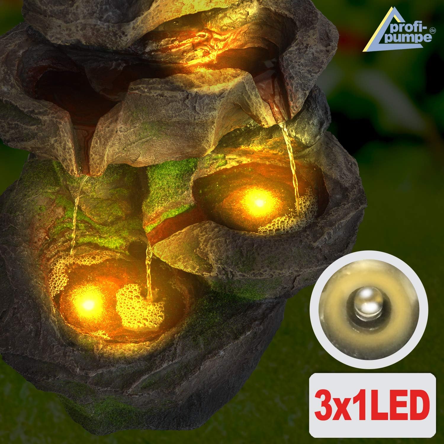 - Mit 230V/12V-Anschluss | Inkl. 3,6 Watt Pumpe | Inkl. LED-Beleuchtung in warmem Weiss (austauschbar) | Inkl. Anschluss-Zubehör: 5m Pumpenkabel, 0,6m LED-Kabel, 12V-Adapter