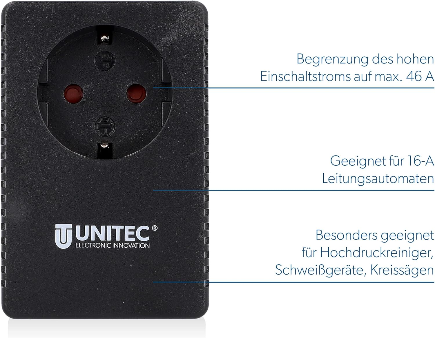 - Produkt 1: Begrenzung des Einschaltstromes auf max. 46 A durch den UNITEC Anlaufstrombegrenzer, mit integrierter Temperaturüberwachung