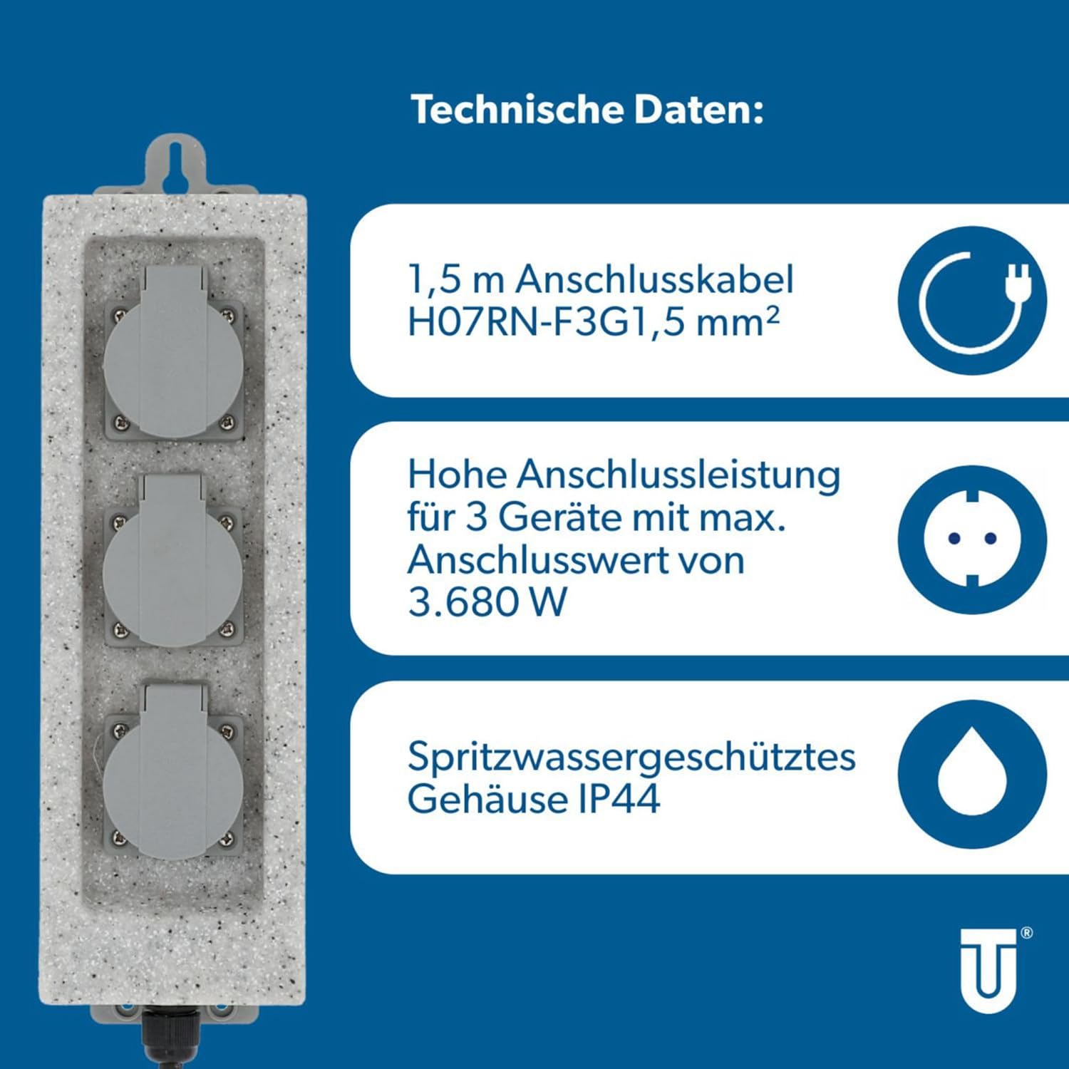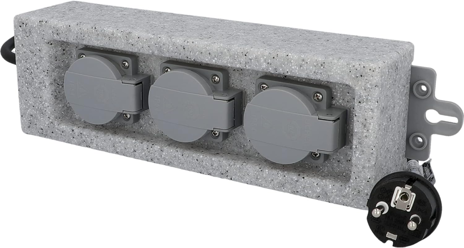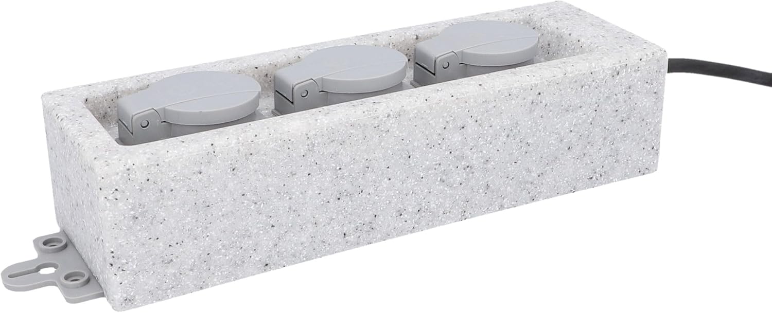 - WITTERUNGSBESTÄNDIG: Aufgrund seines aus hochwertigem Kunstharz gefertigten Gehäuses sowie der spritzwasserfesten Bauart nach Schutzart IP44 hält der Steckdosenverteiler für den Garten in Steinoptik jeder Witterung stand