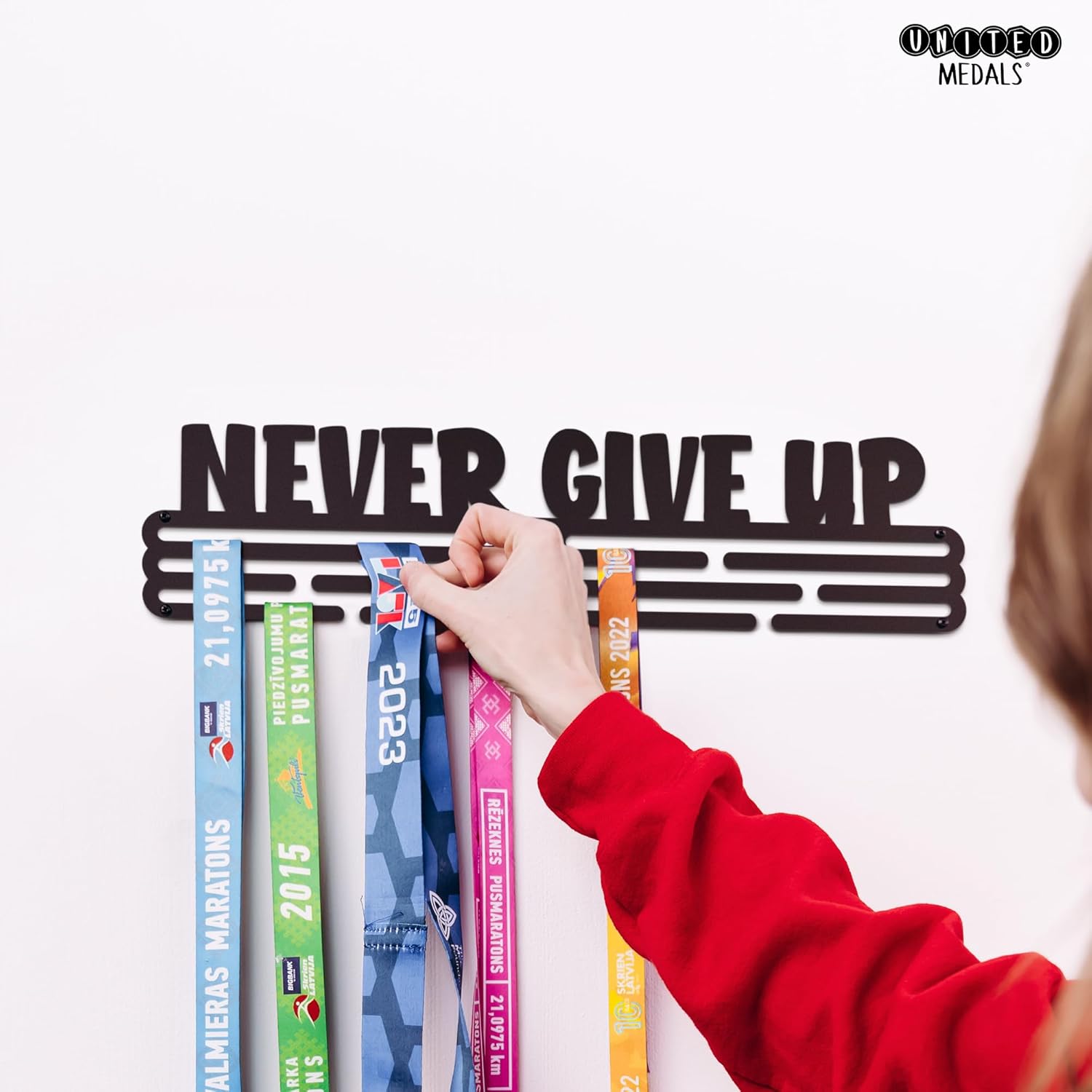 United Medals Never GIVE UP Medaillenhalter Stahl Schwarz | Medaillen Aufhänger | Medal Hanger Holde