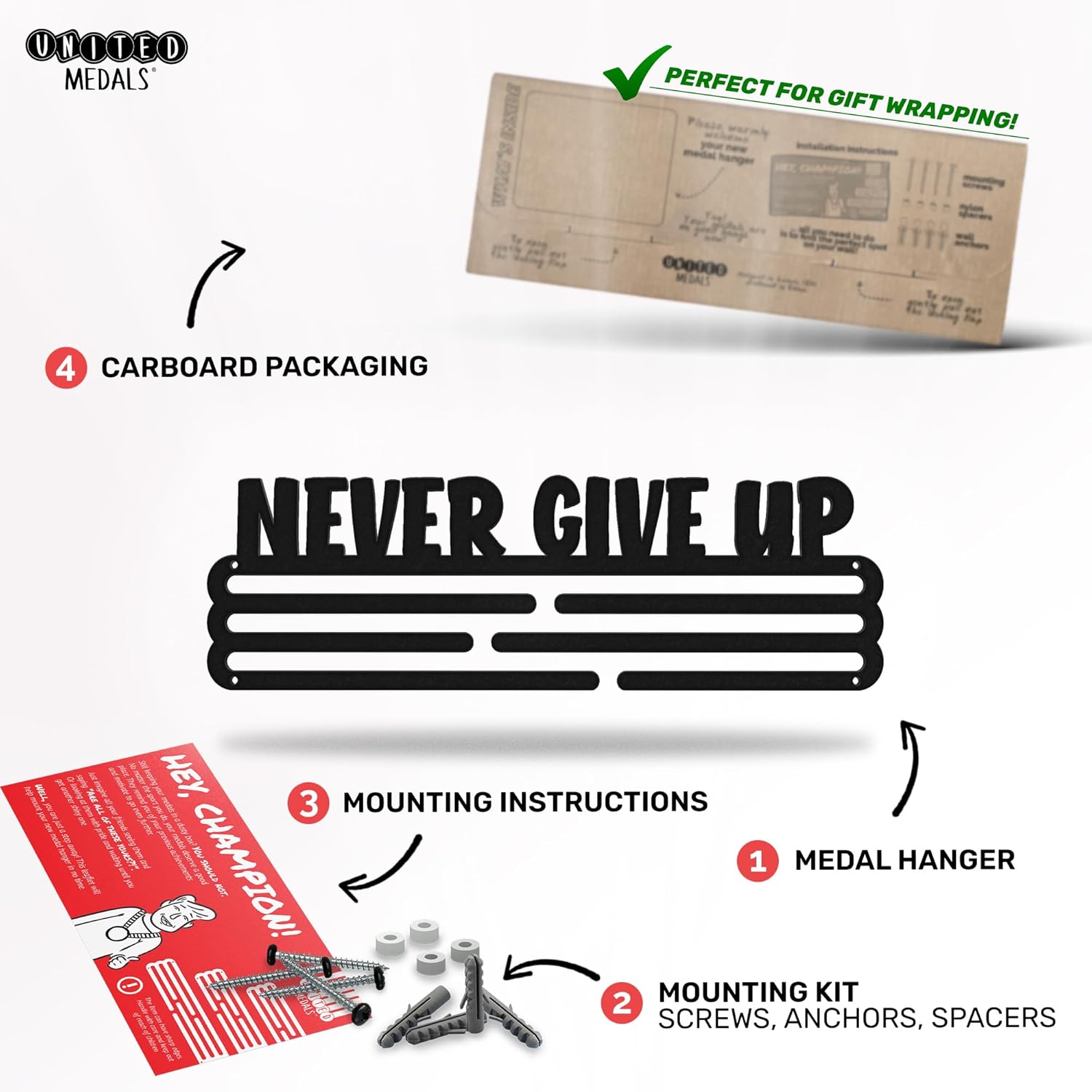 - Einfache Montage – Die lasergeschnittene und präzise verarbeitete Wandhalterung zur Medaillenaufbewahrung lässt sich mit den beiliegenden Schrauben, Dübeln und Abstandshaltern mit nur wenigen Handgriffen anbringen.