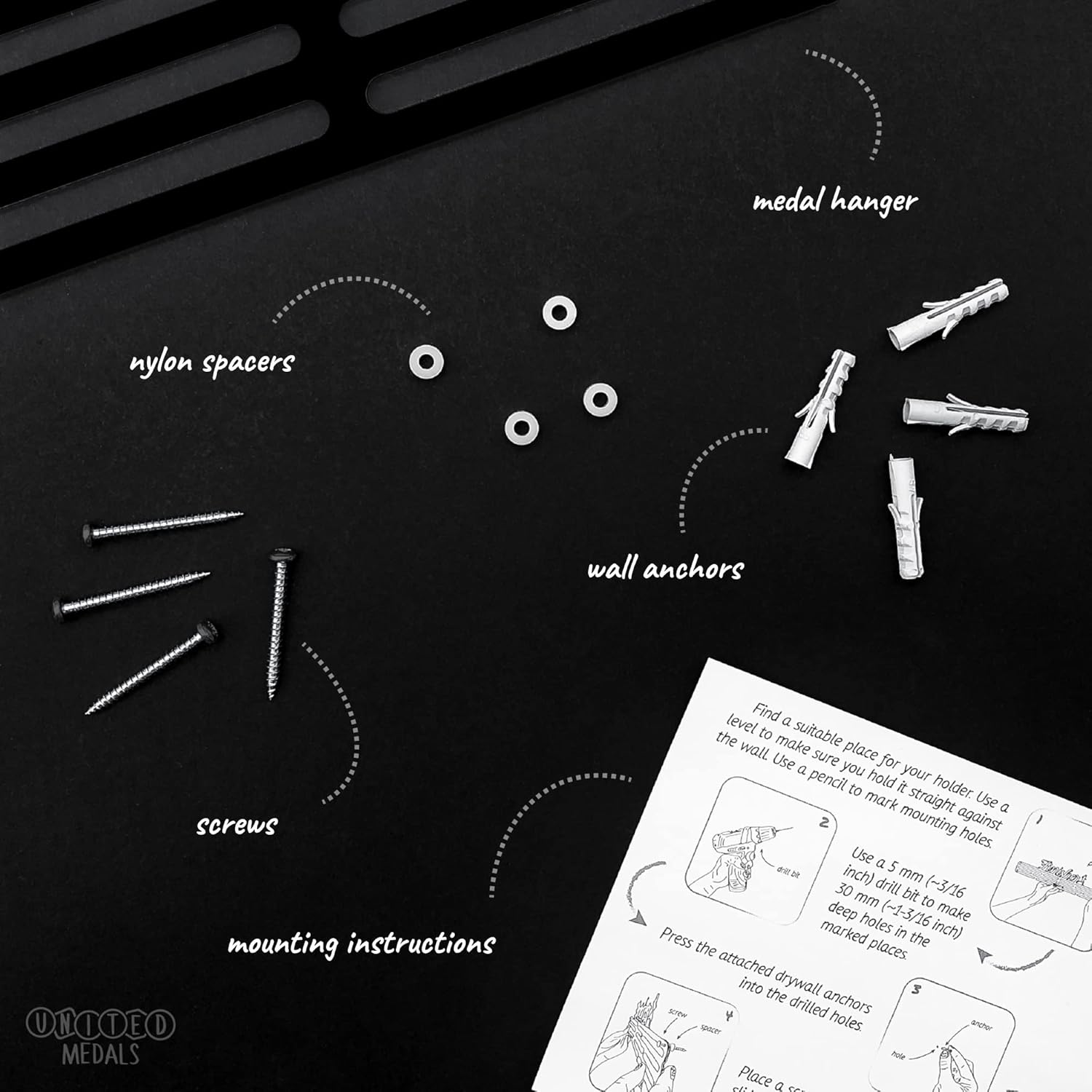 • Einfache Montage – Die lasergeschnittene und präzise verarbeitete Wandhalterung zur Medaillenaufbewahrung lässt sich mit den beiliegenden Schrauben, Dübeln und Abstandshaltern mit nur wenigen Handgriffen anbringen.