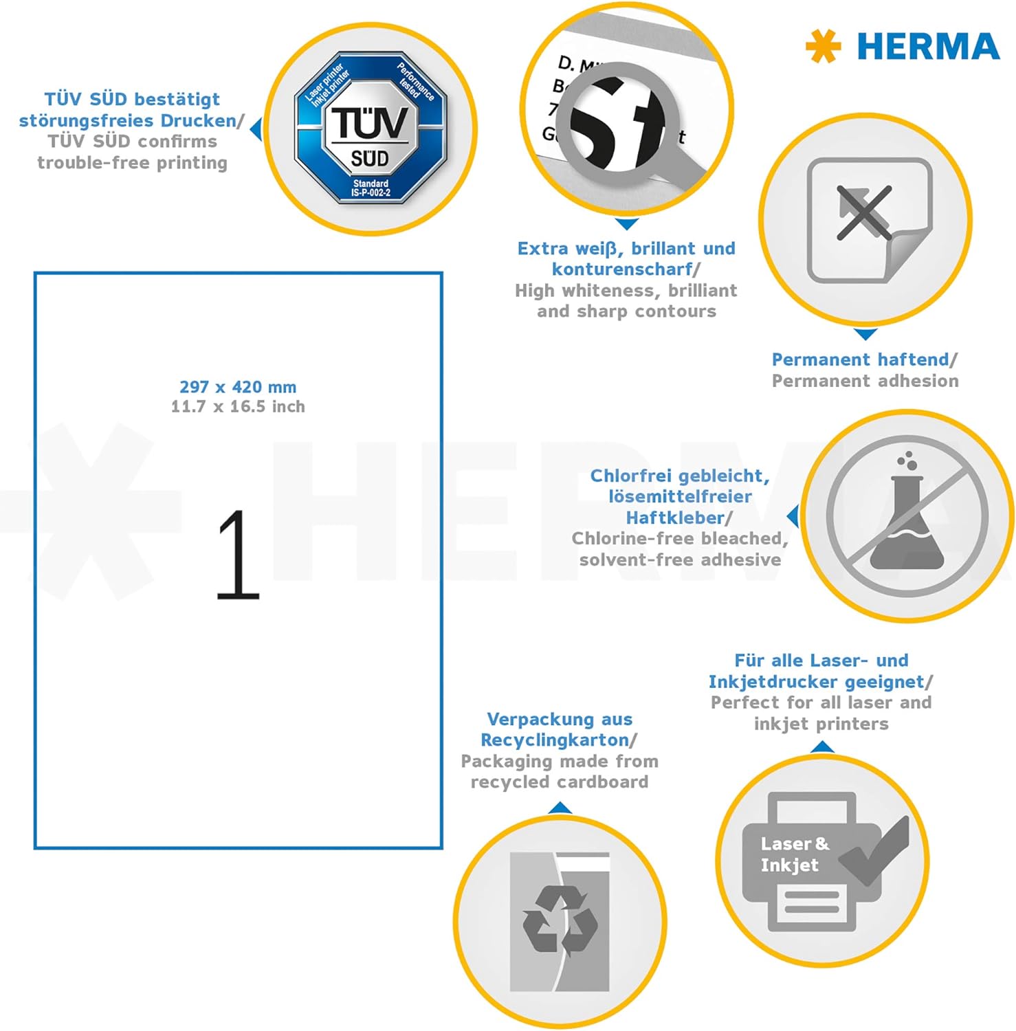 • Lieferumfang: 100 x HERMA PREMIUM Etiketten, DIN A3 Format, 29,7 x 42 cm, rechteckig, weiss (100 Blatt je 1 Etikett)
