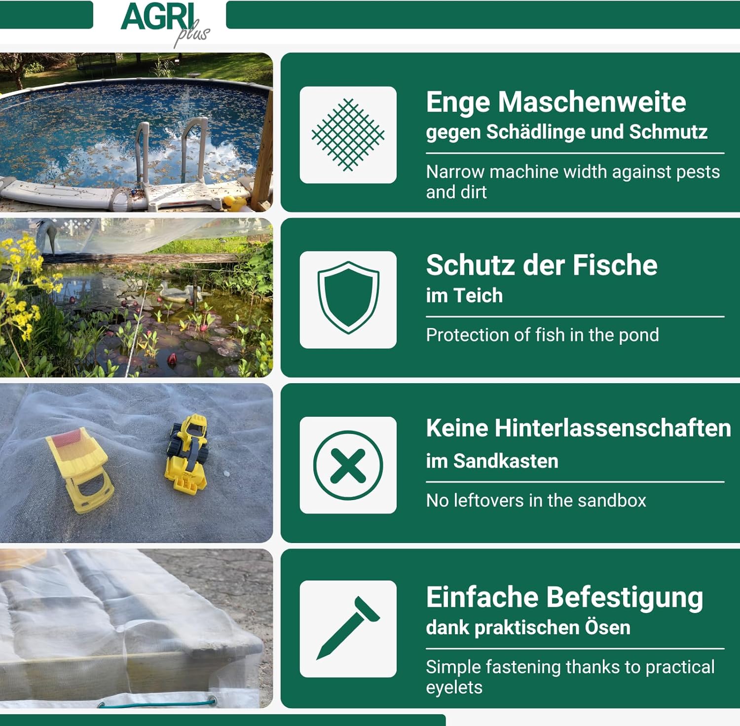 - OPTIMALER SCHUTZ - Das Universalnetz fängt Laub & Dreck in Ihrem Pool & Sandkasten auf, schützt Ihre Fische im Teich vor Vögeln & Katzen und hält Schädlinge & Insekten von Ihrem Gemüsebeet fern.