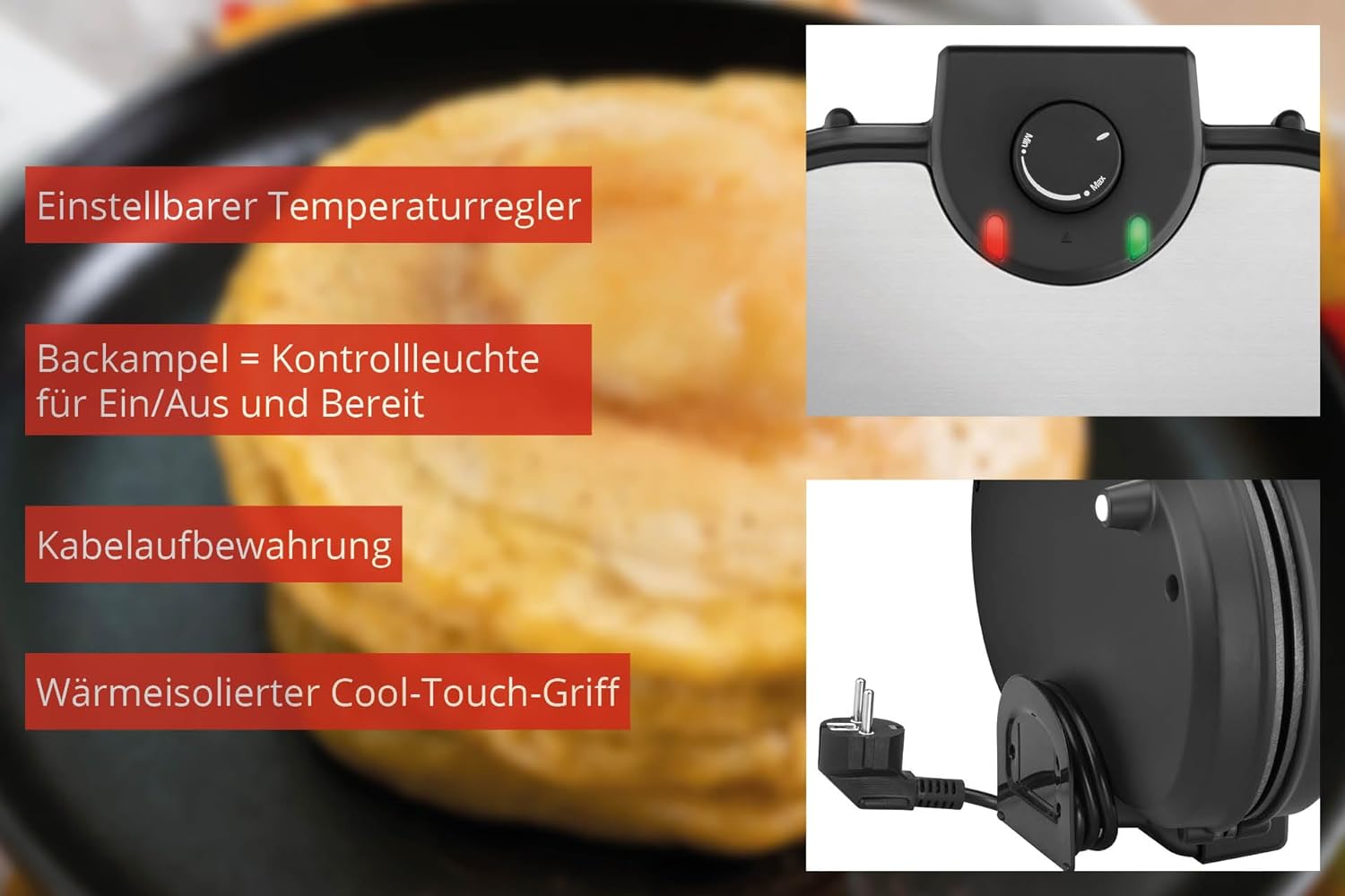 - Wärmeisolierter Cool-Touch-Griff / Einfache Reinigung durch Antihaftbeschichtung und Teigauffangrinne
