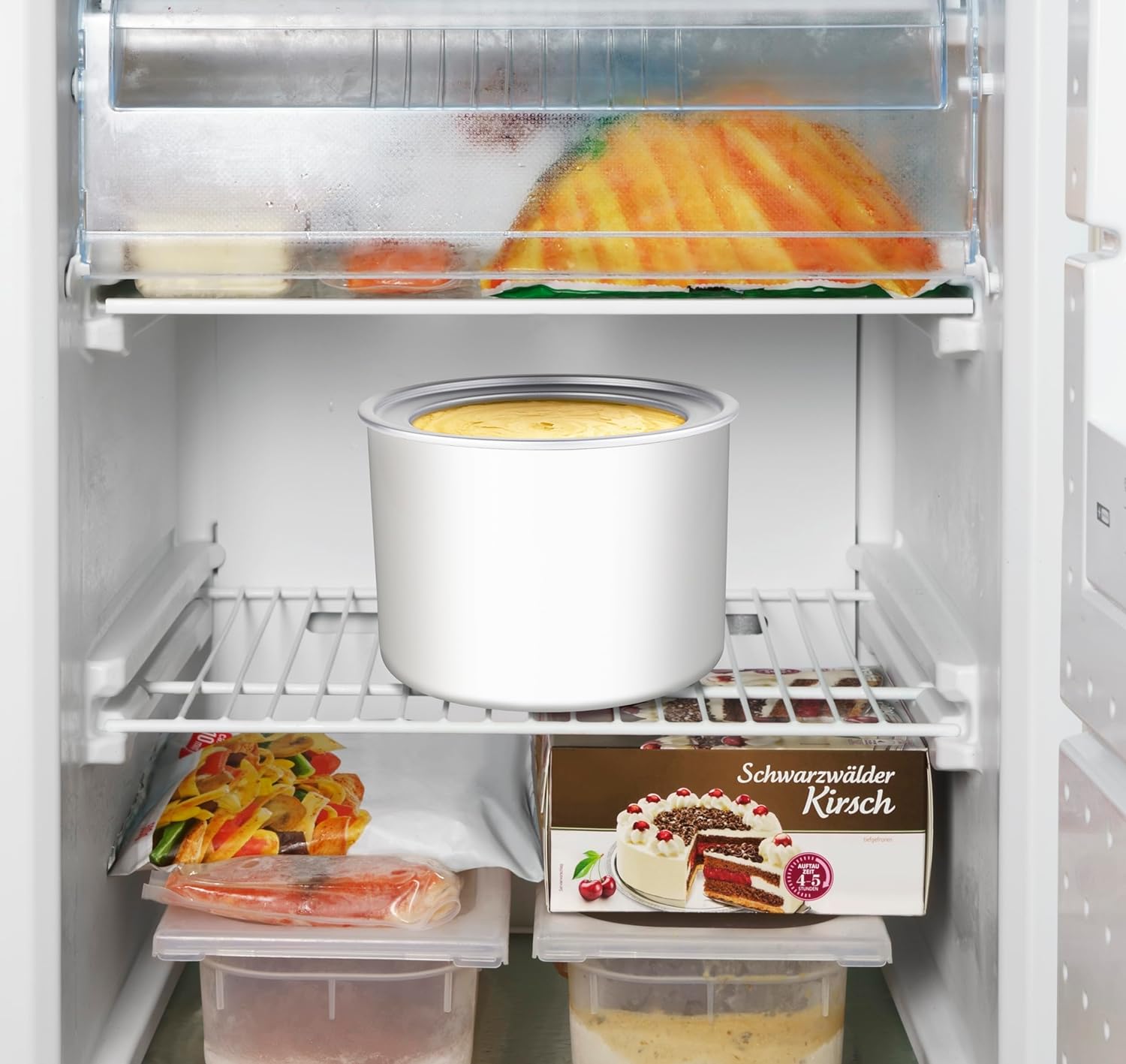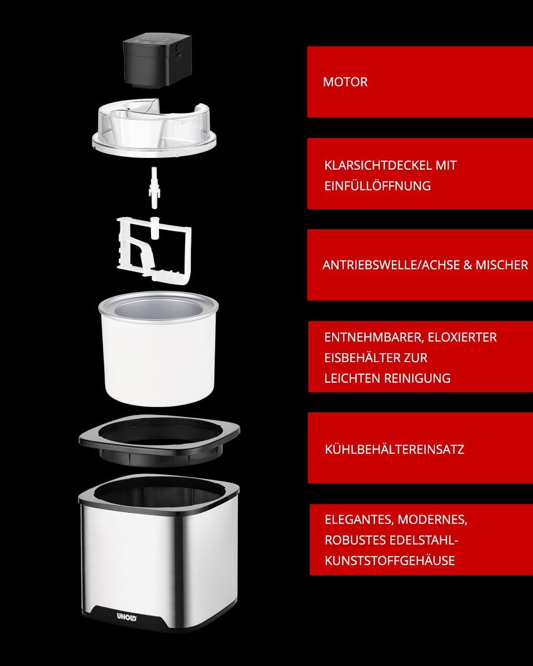 - Entnehmbarer, eloxierter Eisbehälter zur leichten Reinigung / Deckelöffnung zum Zufügen von Zutaten wie bspw. Nüsse