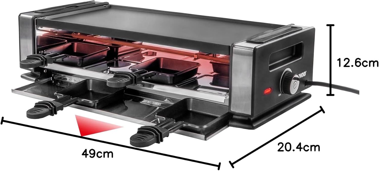 - Raclette für bis zu 8 Personen / Halterung für optional erhältliche Dunstabzugshaube / Grosse wendbare Grillplatte aus Druckguss-Aluminium zur leichten Reinigung, Greblon Antihaftbeschichtung
