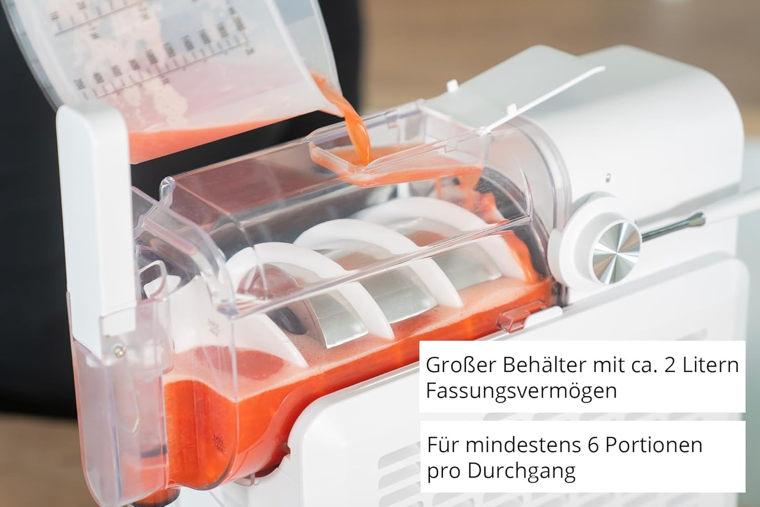- Grosser Behälter mit ca. 2 Litern Fassungsvermögen (maximale Füllmenge 1,5 Liter) für mindestens 6 Portionen pro Durchgang