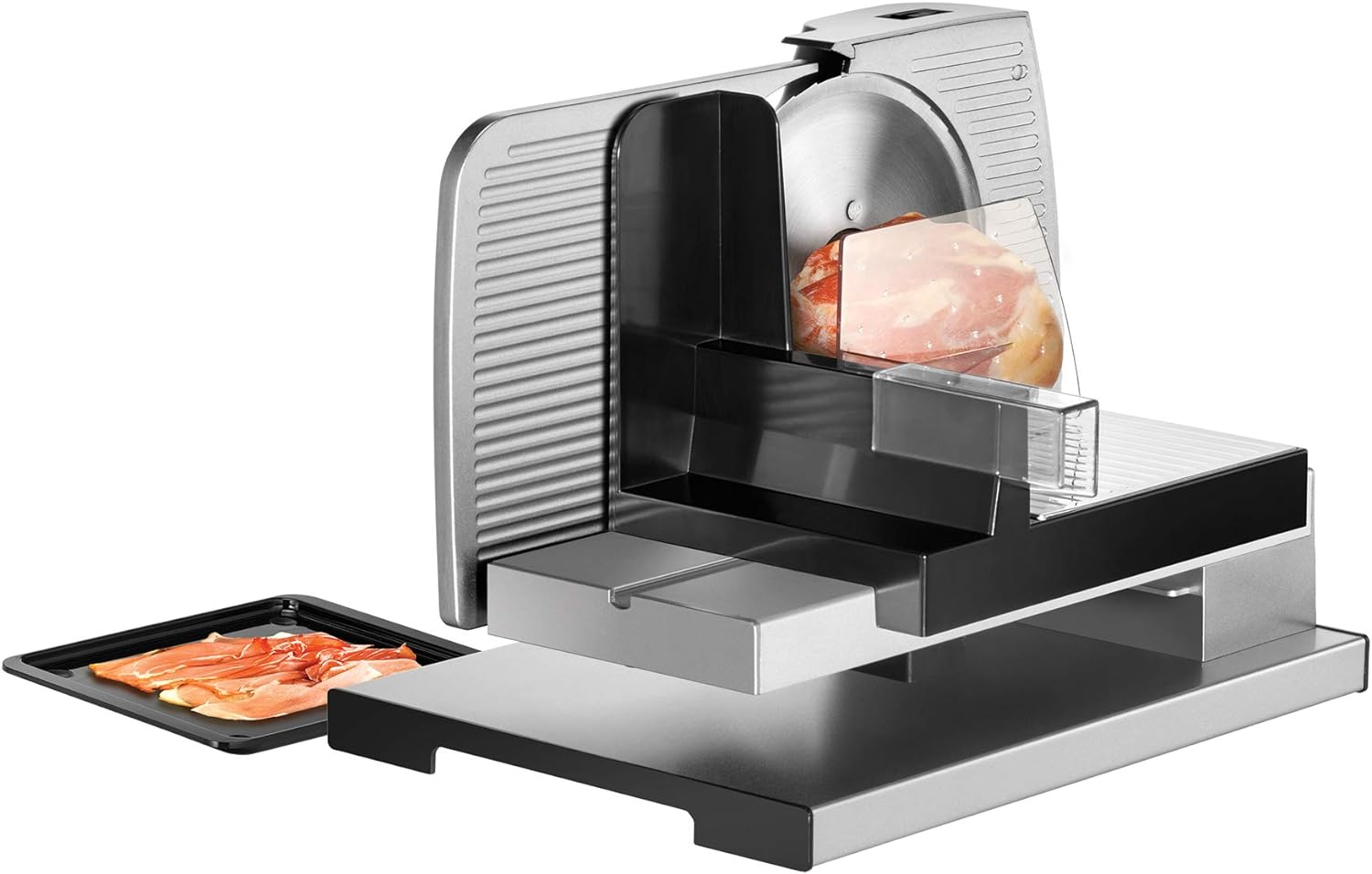 • Metall-Allesschneider mit freischwebender Konstruktion / Entnehmbares Edelstahl-Wellenschliffmesser (ca. Ø 17 cm)