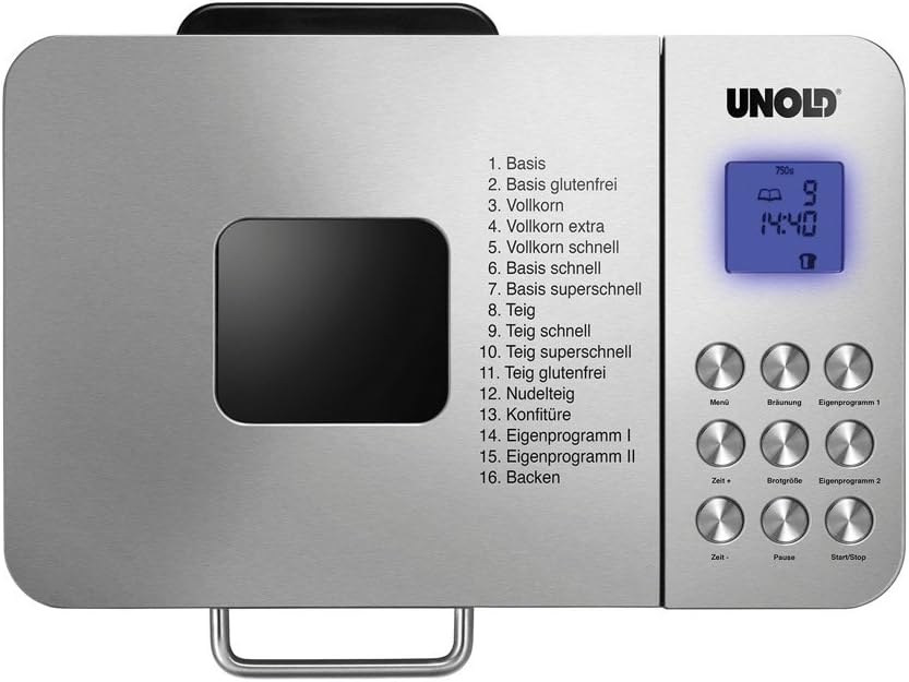 - 16 gespeicherte Programme (alle Programme für glutenfreies Brot geeignet)davon sind 2 Eigenprogramme, 1 Programm für Marmelade/Konfitüre und 1 Programm für Nudelteig