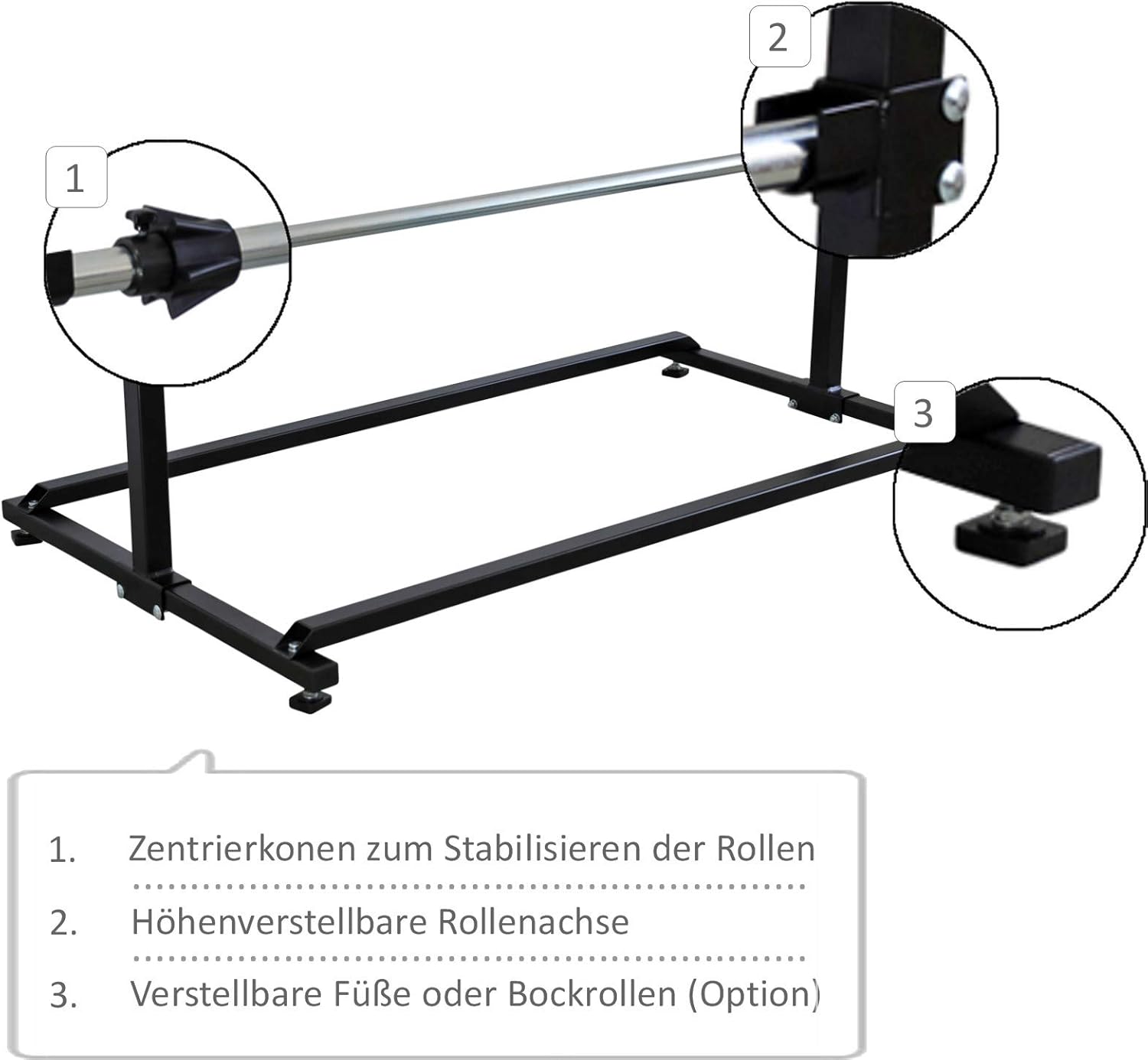 - Vorteil: sicheres Verpacken + Polstern ihrer Ware | 1 höhenverstellb. Achse | feststellbare Konen zum Zentrieren der Materialrollen | 4 justierbare Standfüsse + 4 fahrbare Lenkrollen (2 Stück bremsbar)