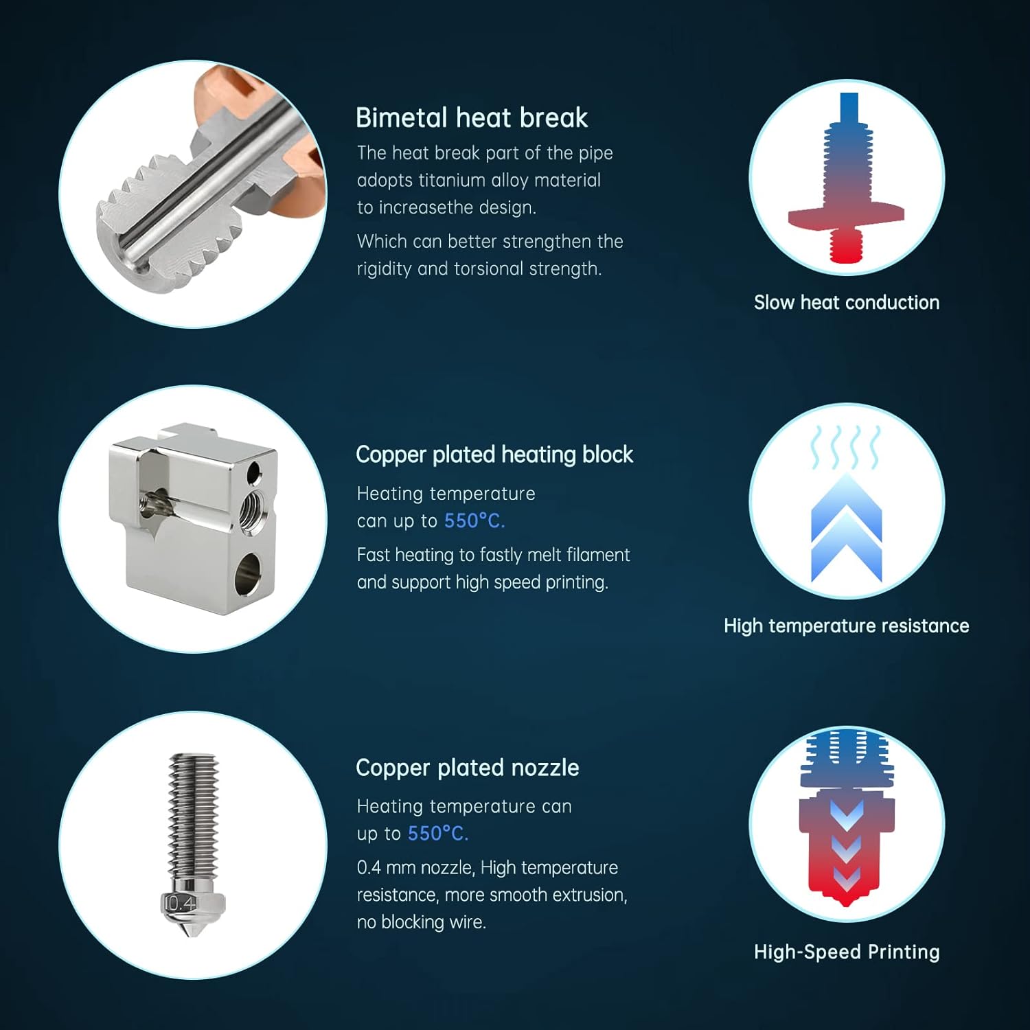 - Upgraded Heatbreak ist ein dreiteiliger, fest verbundener, nicht abnehmbarer integrierter Hitzeschutz, verbunden durch den Fixierblock des Heatbreak und das Gewinde des Heizkörpers und bequeme Demontage, bessere Wärmeleitung und Wärmeableitungseffekt,