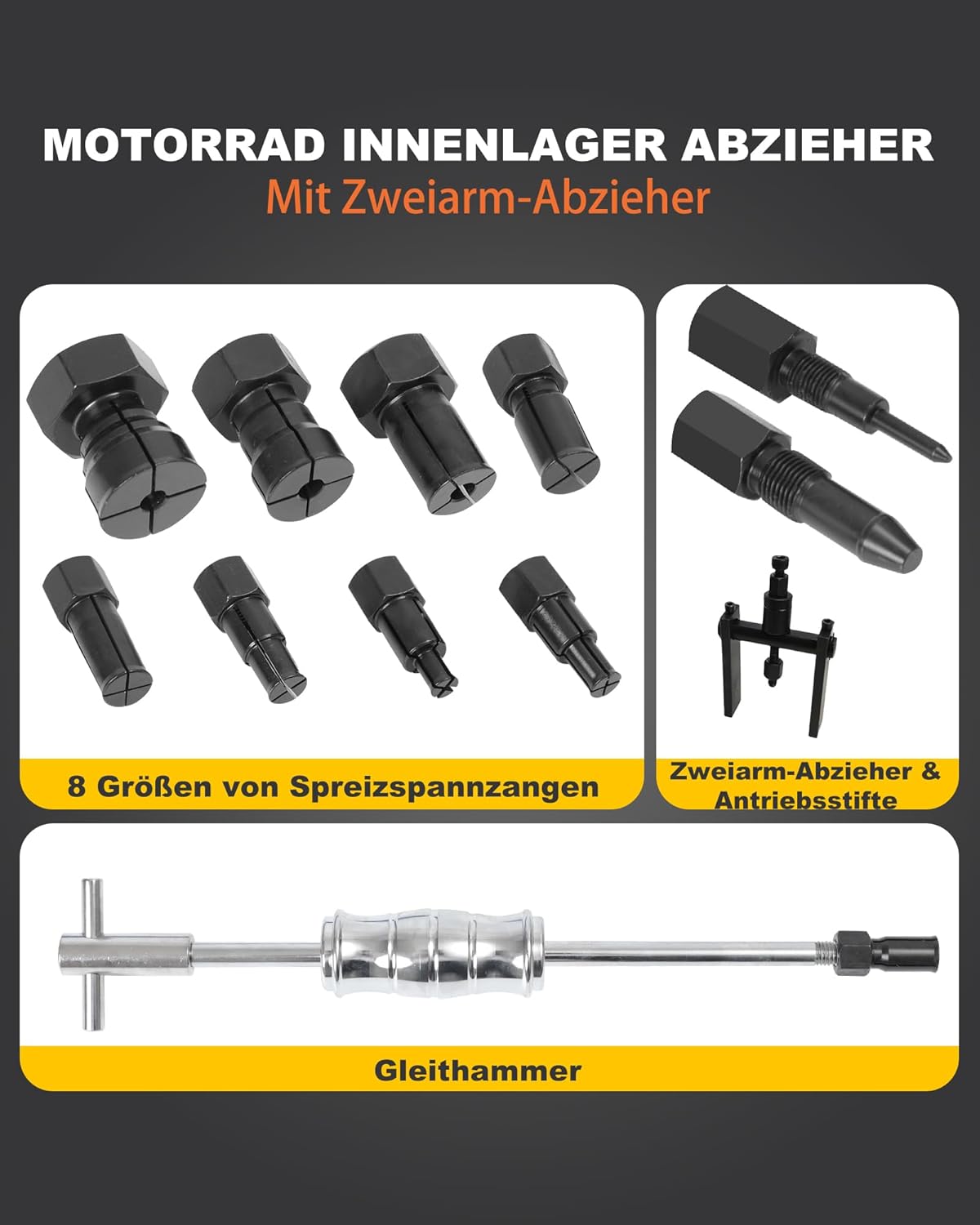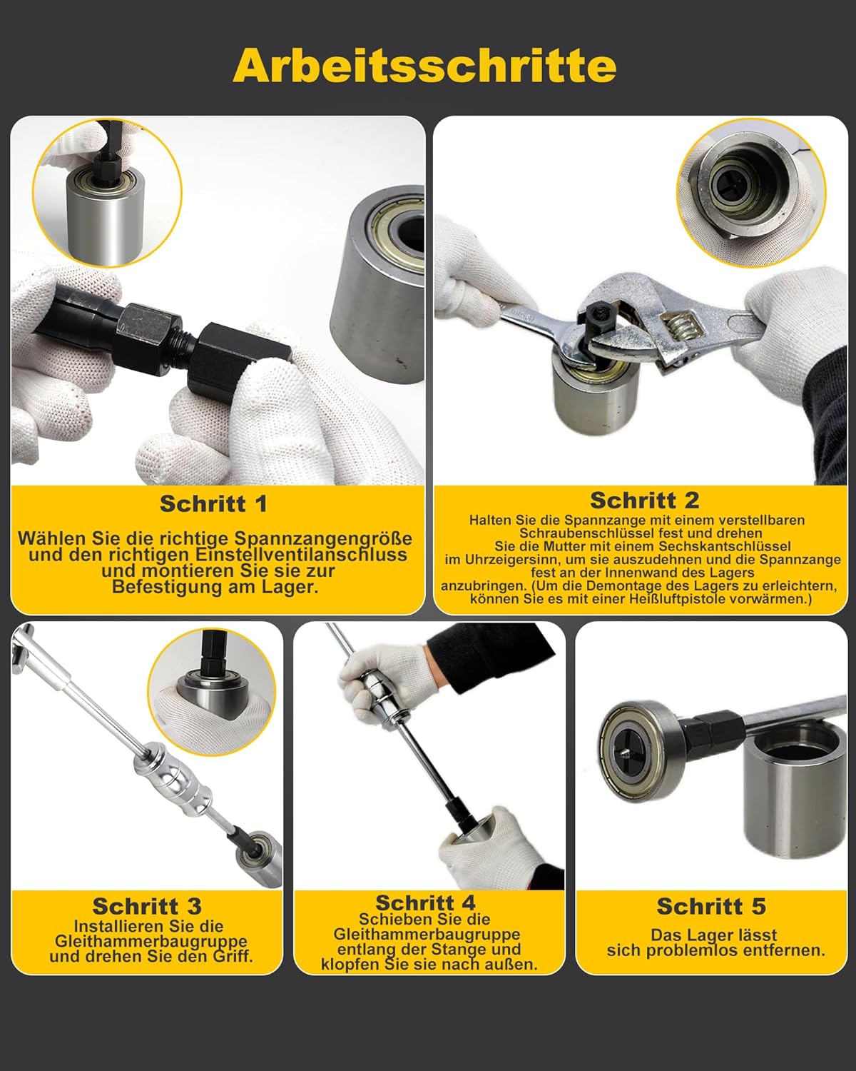 • Langlebig und hochwertige Konstruktion: Die Komponenten des Sets, einschliesslich Gleithammer und Abzieher, sind aus hochwertigem Stahl gefertigt, um den beim Lagerausbau auftretenden Kräften standzuhalten. So hält das Werkzeug regelmässiger